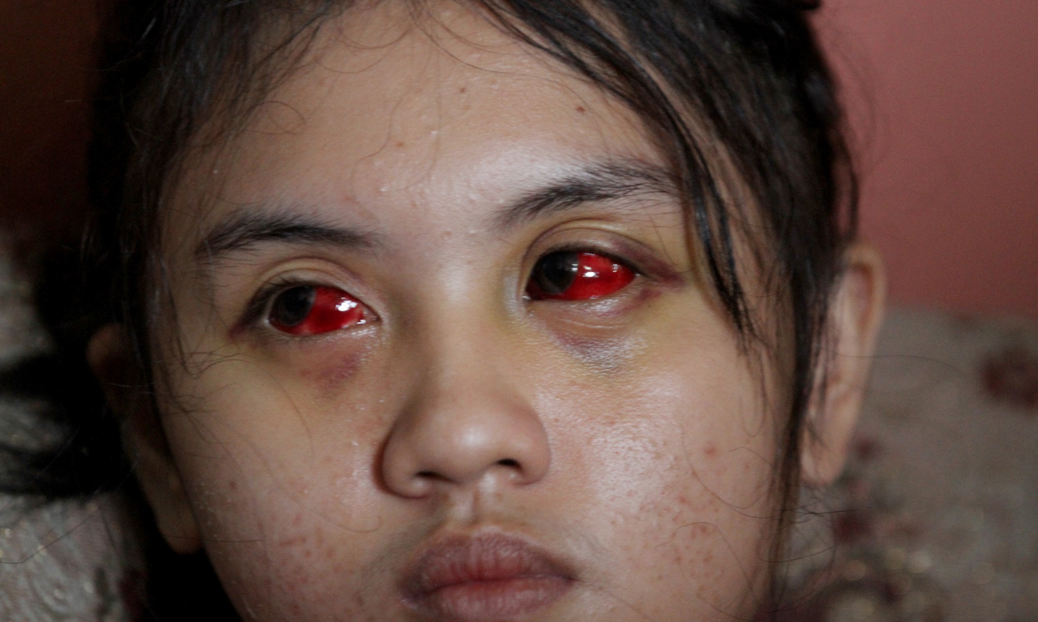 Suporter Arema FC (Aremania) Cahayu Nur Dewata menunjukkan matanya yang masih memerah akibat menjadi salah satu korban luka di Tragedi Kanjuruhan di Kedungkandang, Malang, Jawa Timur, Rabu (12/10/2022). Cahayu adalah salah satu dari 737 korban luka yang saat terjadinya tragedi Kanjuruhan berada di tribun 12 dan terkena gas air mata serta terinjak-injak penonton lain. ANTARA FOTO/Ari Bowo Sucipto