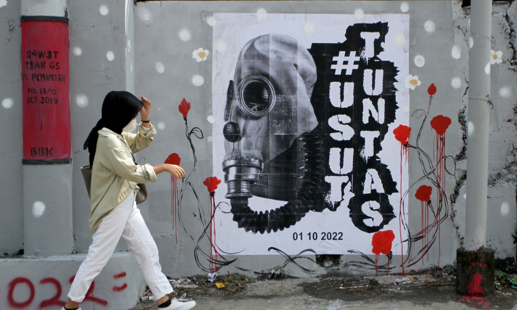 Pejalan kaki melintasi mural bertema tragedi Kanjuruhan di Jalan Simpang Gajayana, Malang, Jawa Timu r, Jumat (14/10/2022). Seni mural dan montase karya seniman Malang tersebut digambar di sejumlah lokasi sebagai ungkapan duka dan keprihatinan atas terjadinya tragedi Kanjuruhan yang menelan ratusan korban jiwa. ANTARA FOTO/Ari Bowo Sucipto
