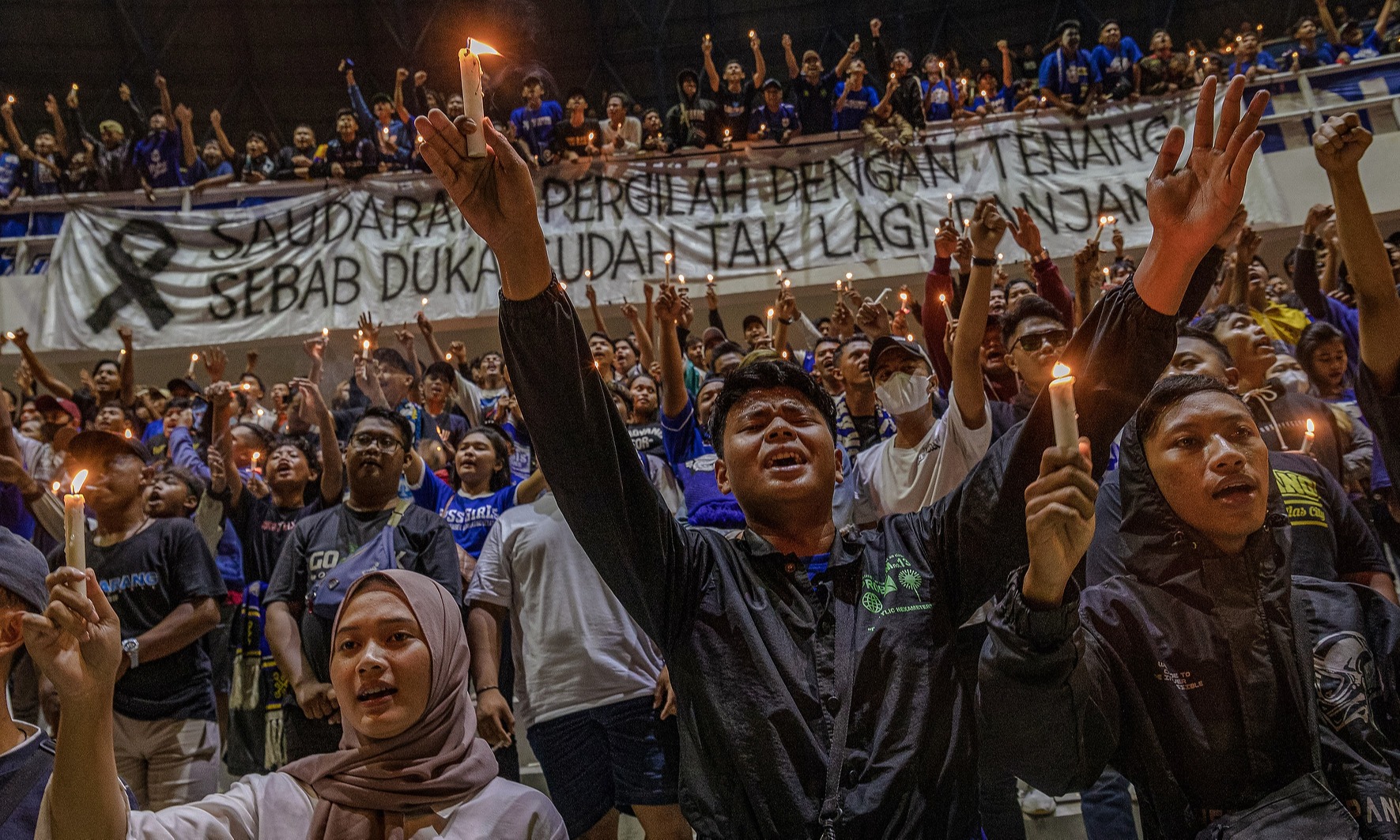 Sejumlah suporter PSIS Semarang menyalakan lilin di Stadion Jatidiri, Semarang, Jawa Tengah, Minggu (2/10/2022). Aksi menyalakan lilin dan doa bersama suporter PSIS Semarang itu sebagai bentuk solidaritas duka cita atas jatuhnya korban jiwa dalam tragedi kerusuhan usai laga lanjutan BRI Liga 1 Arema FC melawan Persebaya di Stadion Kanjuruhan, Malang pada Sabtu (1/10). ANTARA FOTO/Aji Styawan