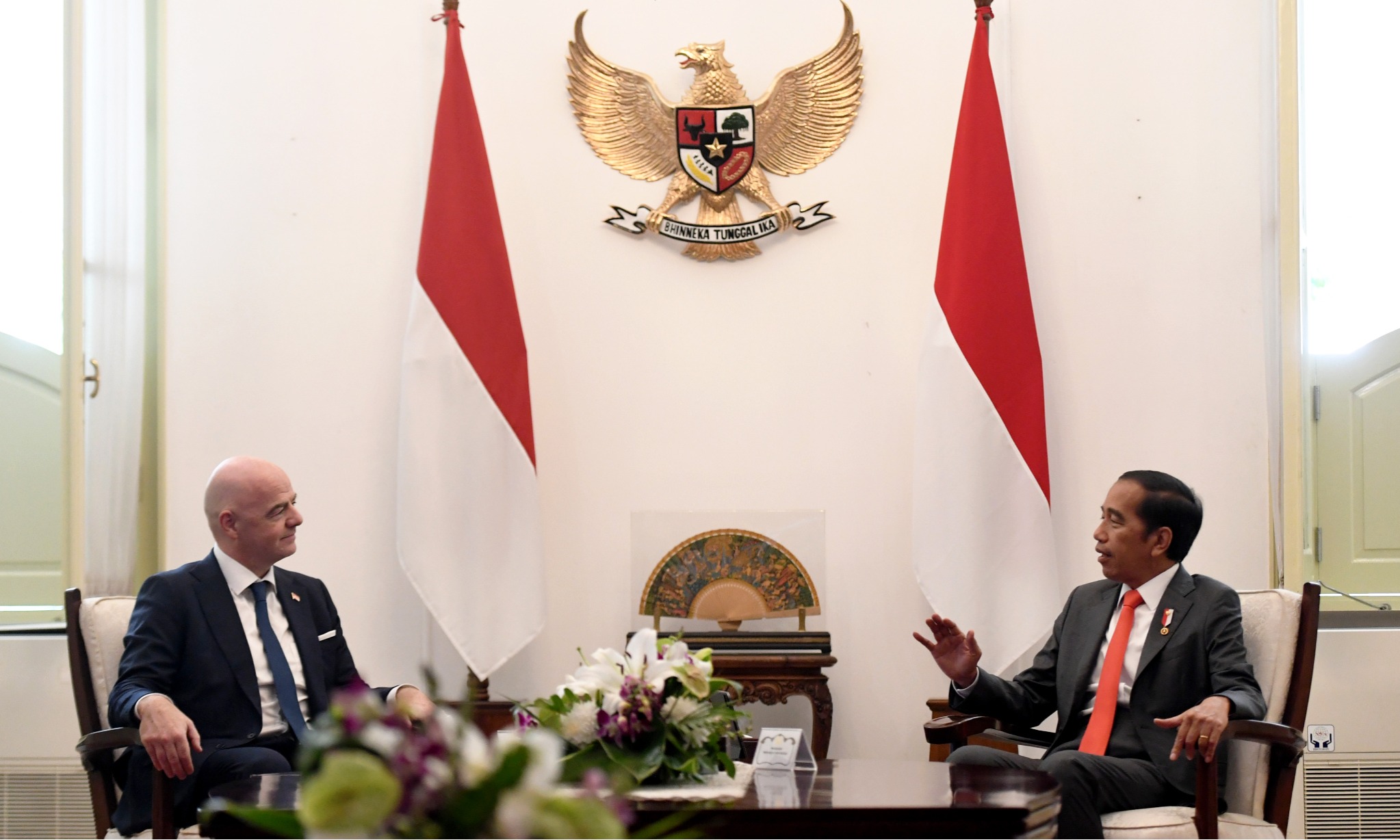 Presiden Joko Widodo (kanan) melakukan pertemuan dengan Presiden Induk Asosiasi Sepak Bola Dunia (FIFA) Gianni Infantino di Istana Merdeka, Jakarta, Selasa (18/10/2022). Dalam pertemuan tersebut Pemerintah Indonesia dan FIFA sepakat untuk melakukan transformasi menyeluruh sepak bola Indonesia serta memastikan semua aspek pertandingan berjalan sesuai dengan standar keamanan yang ditetapkan FIFA. ANTARA FOTO/Hafidz Mubarak A