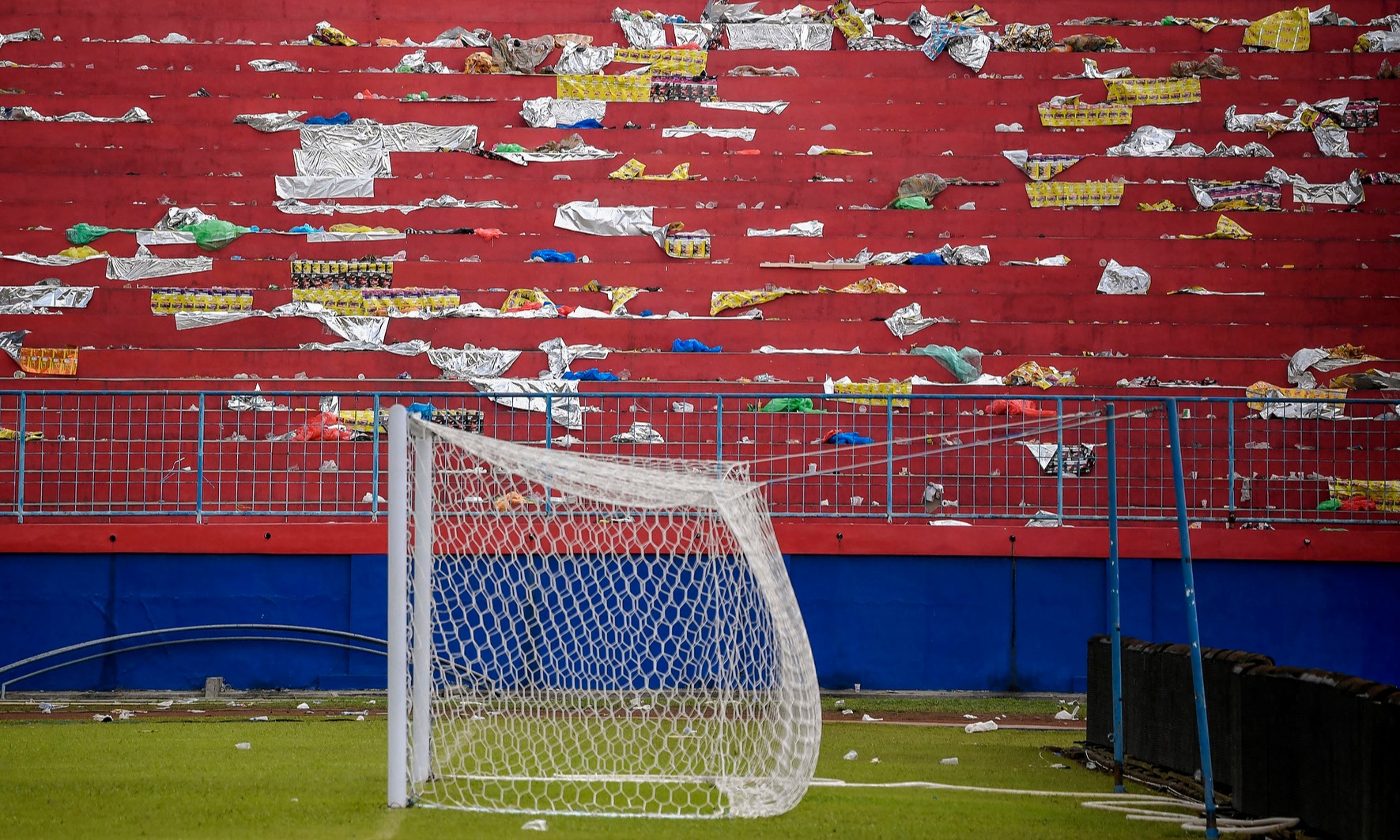 Kondisi tribun penonton Stadion Kanjuruhan usai kerusuhan terjadi di stadion itu, Malang, Jawa Timur , Minggu (2/10/2022). Sedikitnya 129 orang dilaporkan meninggal dunia dan 13 mobil rusak akibat kerusuhan tersebut. ANTARA FOTO/Zabur Karuru