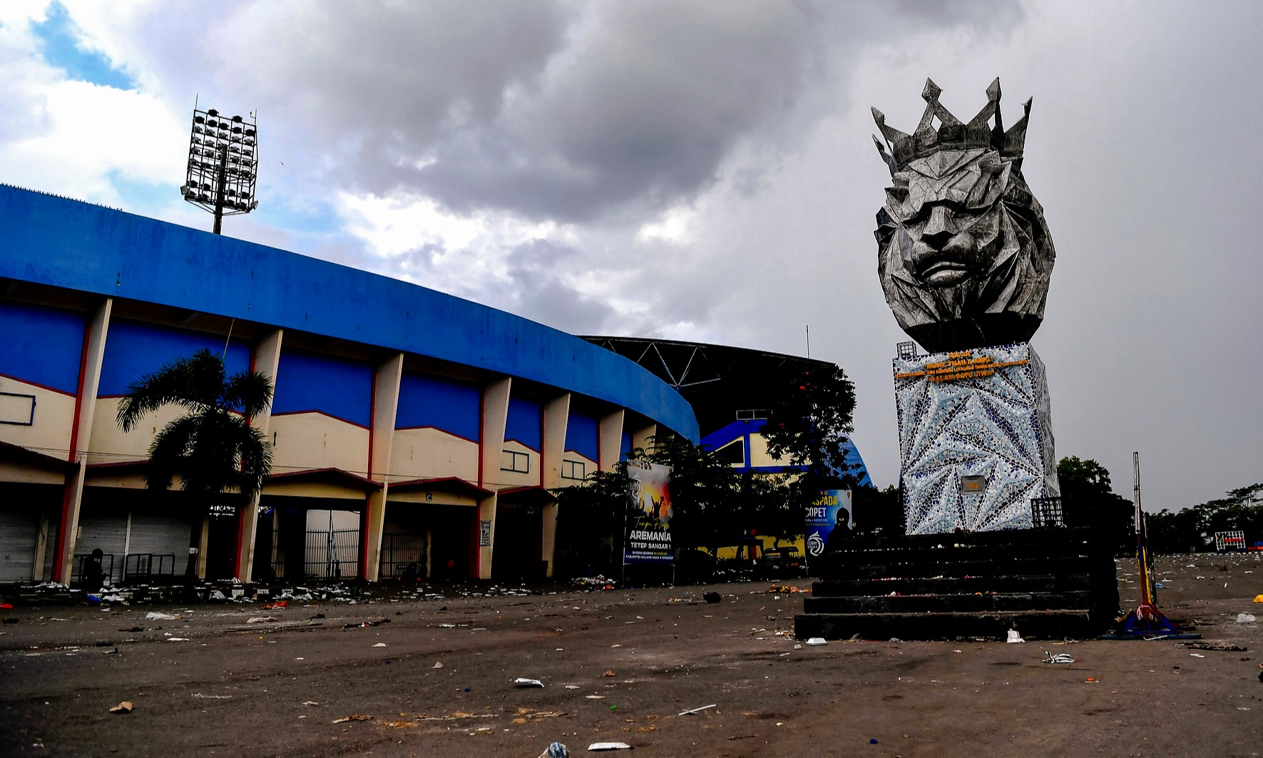 Kondisi halaman Stadion Kanjuruhan usai kerusuhan terjadi di stadion itu, Malang, Jawa Timur, Minggu (2/10/2022). Sedikitnya 129 orang dilaporkan meninggal dunia dan 13 mobil rusak akibat kerusuhan tersebut. ANTARA FOTO/Zabur Karuru