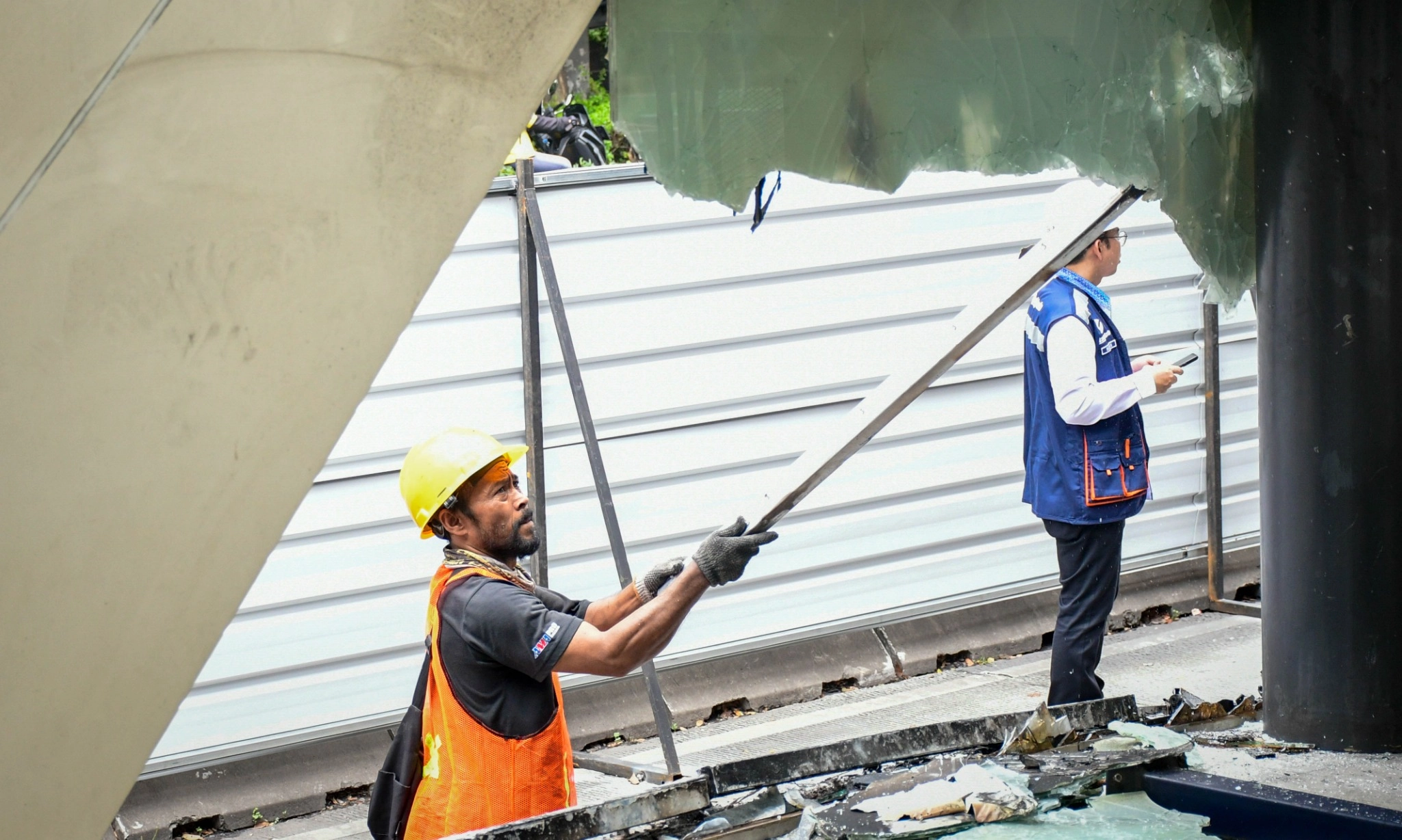Seorang petugas dinas jakarta yang tengah memperbaiki kaca yang rusak akibat demonstrasi di Halte Senayan Bank DKI, Jakarta (01/09/2025). Validnews/Hasta Adhistra.Situasi serupa juga diduga kembali terjadi. Beberapa jam setelah kerusuhan terjadi, terdapat seruan di media sosial yang mengimbau massa untuk tetap menjaga fasilitas, serta sarana dan prasarana transportasi umum.