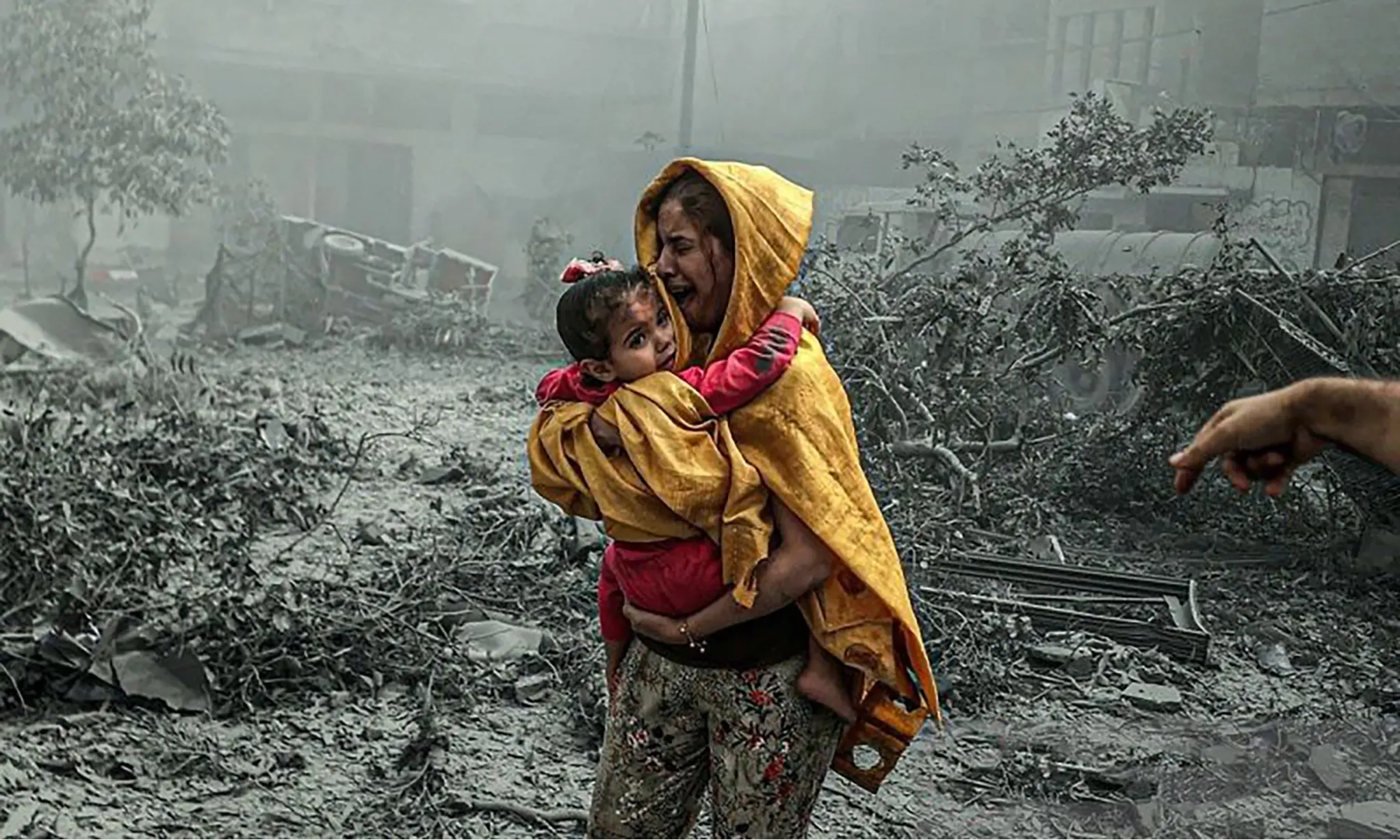 Seorang wanita menggendong seorang gadis bereaksi setelah serangan udara Israel menghantam lingkunga n Ridwan di Kota Gaza, Gaza pada 23 Oktober 2023. Antara/Ali Jadallah /Anadolu