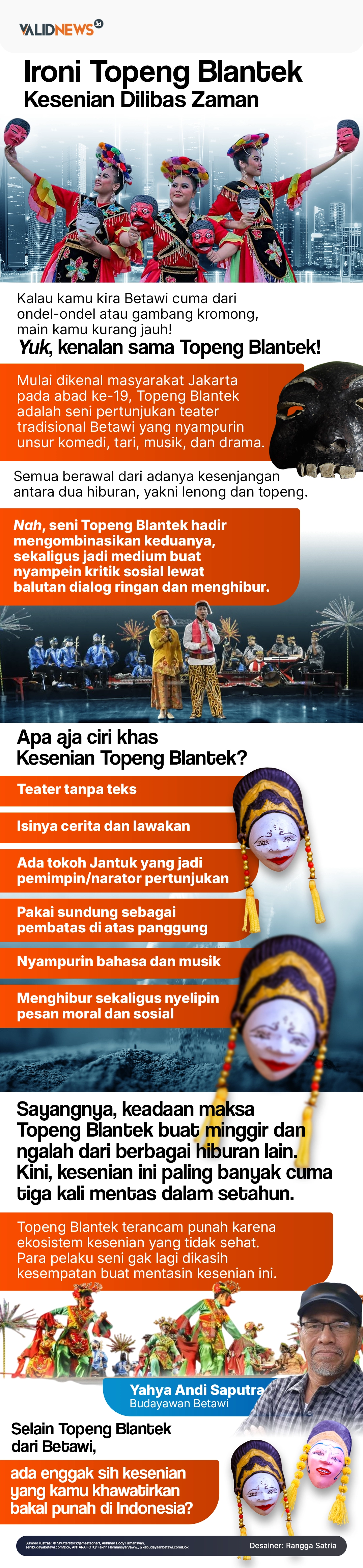 Teater khas Betawi, topeng blantek, terancam punah karena ekosistem kesenian yang tidak sehat. Pelaku seni tidak mendapatkan kesempatan untuk mementaskan topeng blantek.