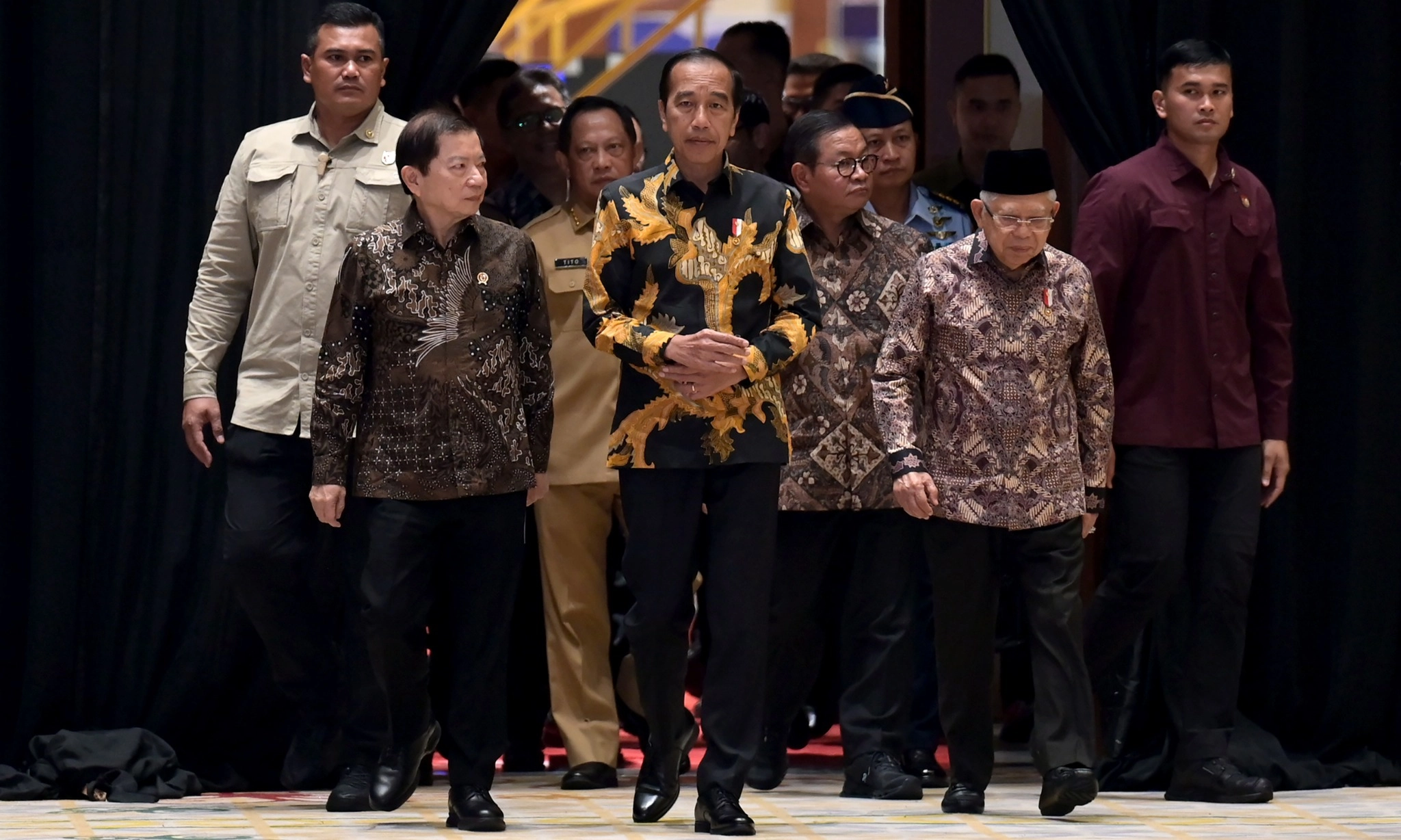 Presiden Joko Widodo (keempat kiri) bersama Wakil Presiden Maruf Amin (kedua kanan) didampingi Mente ri PPN/Kepala Bappenas Suharso Monoarfa (kedua kiri), Mendagri Tito Karnavian (ketiga kiri) dan Seskab Pramono Anung (ketiga kanan) tiba untuk menghadiri pembukaan Musyawarah Perencanaan Pembangunan Nasional (Musrenbangnas) 2024 di Jakarta Convention Center, Jakarta, Senin (6/5/2024). Antara Foto/Sigid Kurniawan
