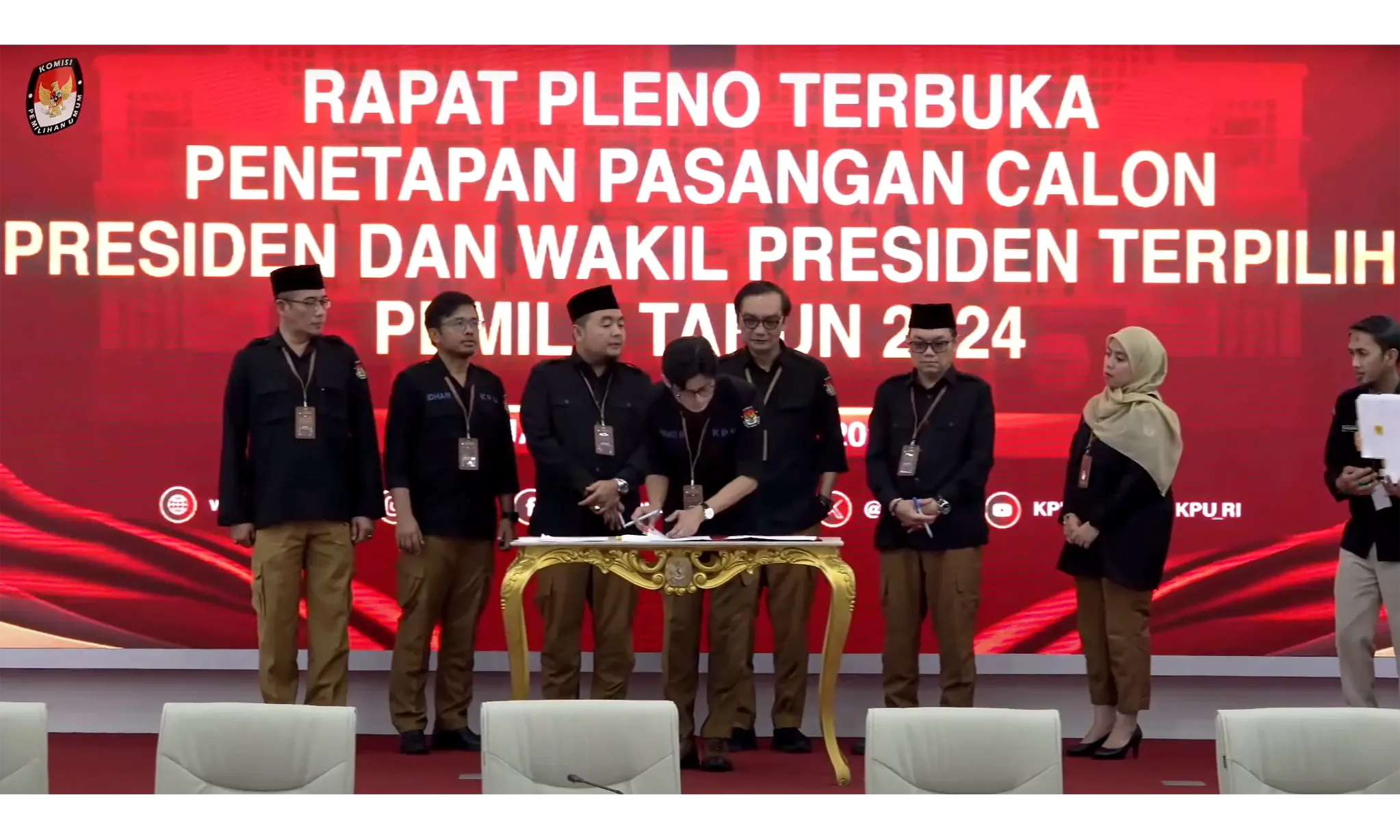 KPU RI menetapkan Prabowo dan Gibran sebagai Presiden-Wapres 2024-2029 dalam rapat pleno terbuka penetapan pasangan calon Presiden dan Wakil Presiden terpilih Pemilu 2024 Gedung Komisi KPU Jakarta, Rabu (24/4/2024). Youtube/KPU RI