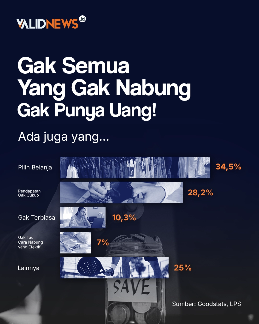 Ada beberapa alasan yang melatarbelakangi orang Indonesia tidak bisa menabung. Pertama, sebanyak 34,5% karena lebih memilih untuk langsung membelanjakan uangnya dibanding menabung. Lalu, 28,2% karena pendapatan tidak mencukupi, 10,3% karena tidak terbiasa, tujuh persen karena tidak tahu cara menabung yang efektif, serta 25% dengan alasan lainnya.
