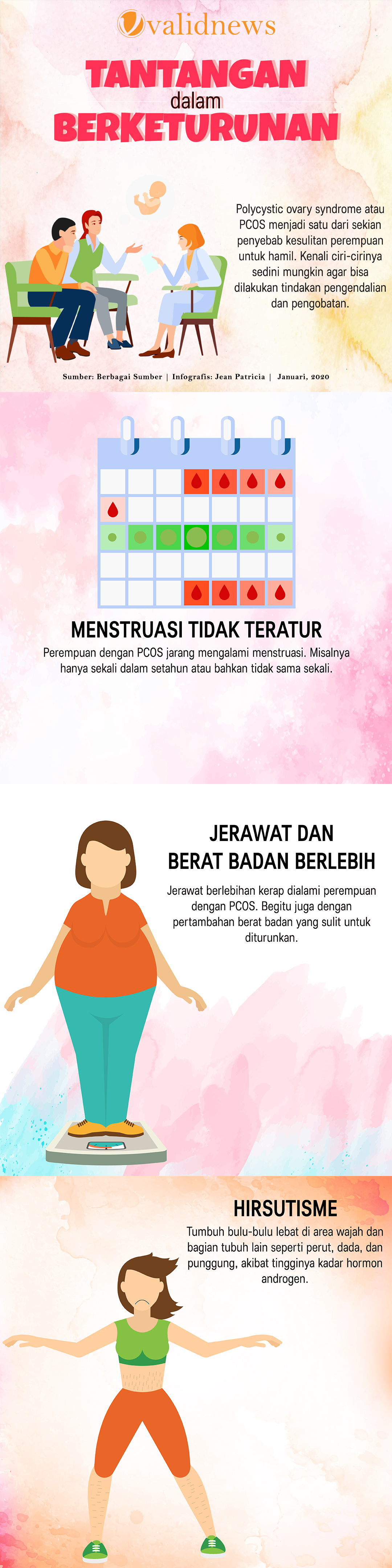 Pasangan suami istri yang telah menikah selama lima tahun tanpa anak memutuskan pergi menemui dokter untuk memeriksakan kesehatan reproduksi mereka. Setelah beberapa kali melakukan pemeriksaan, diketahui sang istri sulit hamil karena memiliki sindrom ovarium poliklistik, yang dalam bahasa Inggris disebut dengan polycystic ovary syndrome (PCOS). Sindrom ini ditandai dengan sel telur sang istri yang berukuran kecil-kecil. Setelah ditelusuri lebih jauh, ternyata sang istri mempunyai riwayat menstruasi yang tidak teratur, yakni kurang dari delapan kali dalam setahun. Agar bisa mengendalikan PCOS, sang istri diminta untuk mengubah gaya hidup.