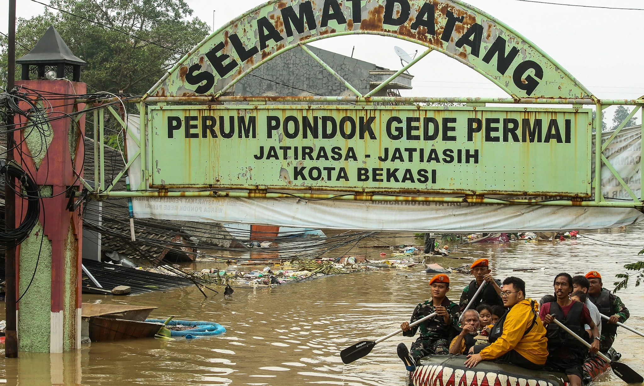 Anggota Kopasgat TNI AU mengevakuasi warga menggunakan perahu karet di Perumahan Pondok Gede Permai, Bekasi, Jawa Barat, Selasa (4/3/2025). AntaraFoto/Jasmine Nadhya Thanaya