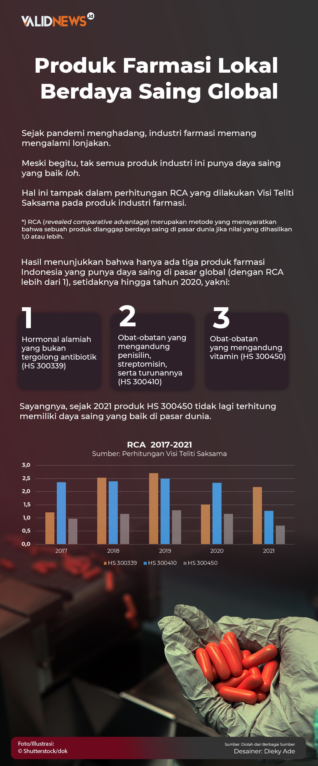 Namun, sayangnya pada 2021, tidak lagi terhitung memiliki daya saing yang baik di pasar dunia. Selain ketiga produk tersebut, tidak ada lagi produk-produk farmasi Indonesia yang memiliki daya saing di pasar global.