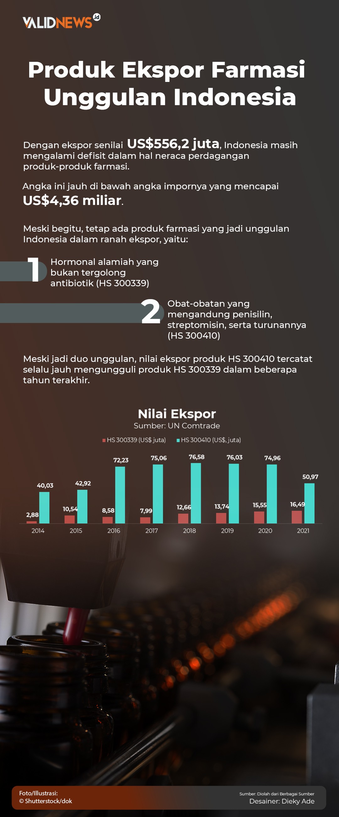 Sementara Indonesia dalam neraca perdagangan produk-produk farmasi mesih mengalami defisit. Nilai impor Indonesia di tahun 2021 mencapai US$ 4,36 miliar, Sedangkan ekspornya hanya sebesar US$US$556,2 juta. Bila dilihat perkembangan kinerja ekspornya, maka dalam beberapa tahun terakhir produk-produk untuk hormonal alamiah yang bukan tergolong antibiotik (HS 300339) dan obat-obatan yang mengandung penisilin, streptomisin serta turunannya (HS 300410), adalah unggulan ekspor farmasi dari Indonesia.