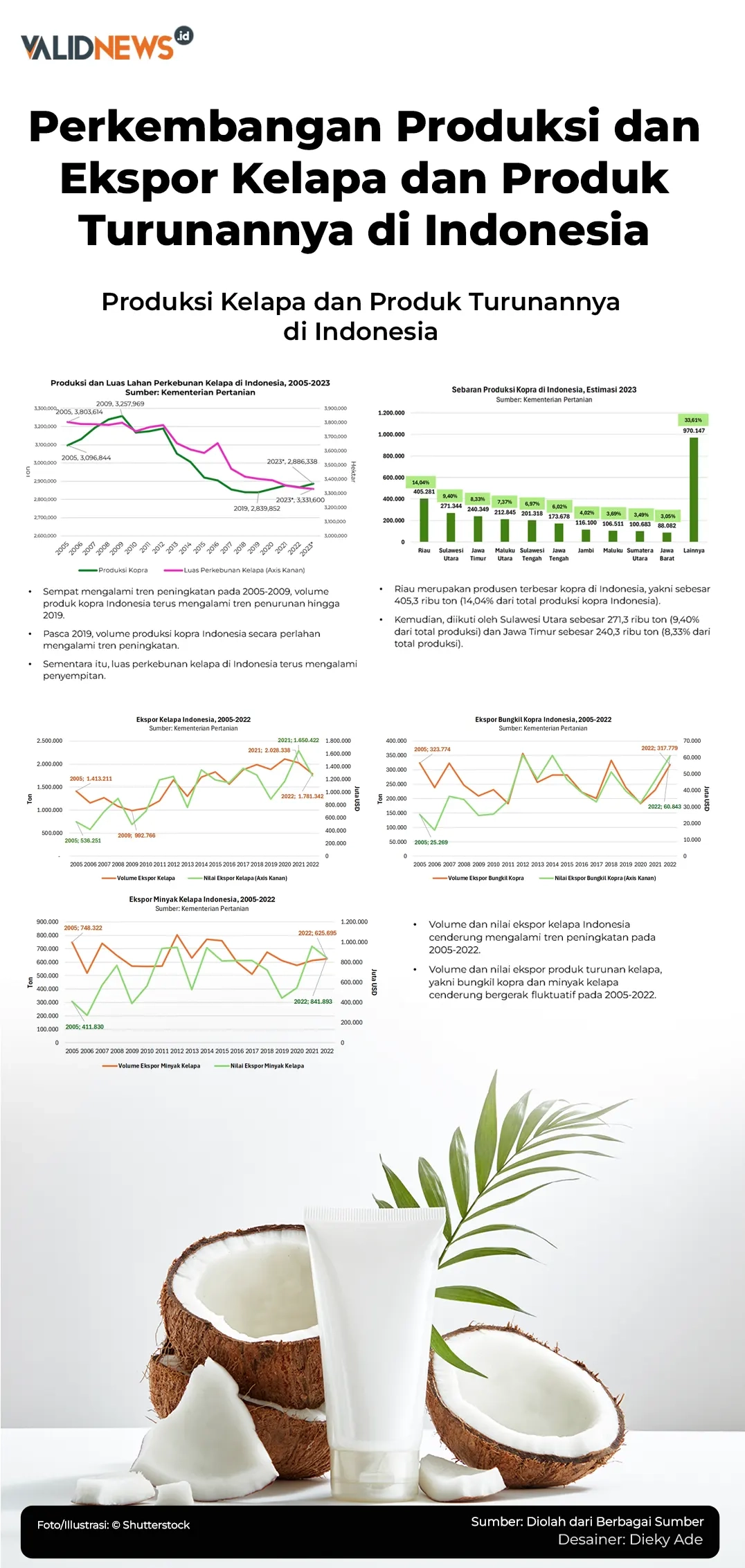 Berdasarkan data kementerian pertanian, diestimasikan, produk kelapa terutama dalam bentuk kopra pada 2023 mencapai 2,88 juta ton. Jumlah ini sedikit meningkat dibandingkan tahun 2022 yaitu sebesar 2,87 juta ton. Pada 2023, diestimasikan luas perkebunan kelapa Indonesia mencapai 3,32 juta hektare.