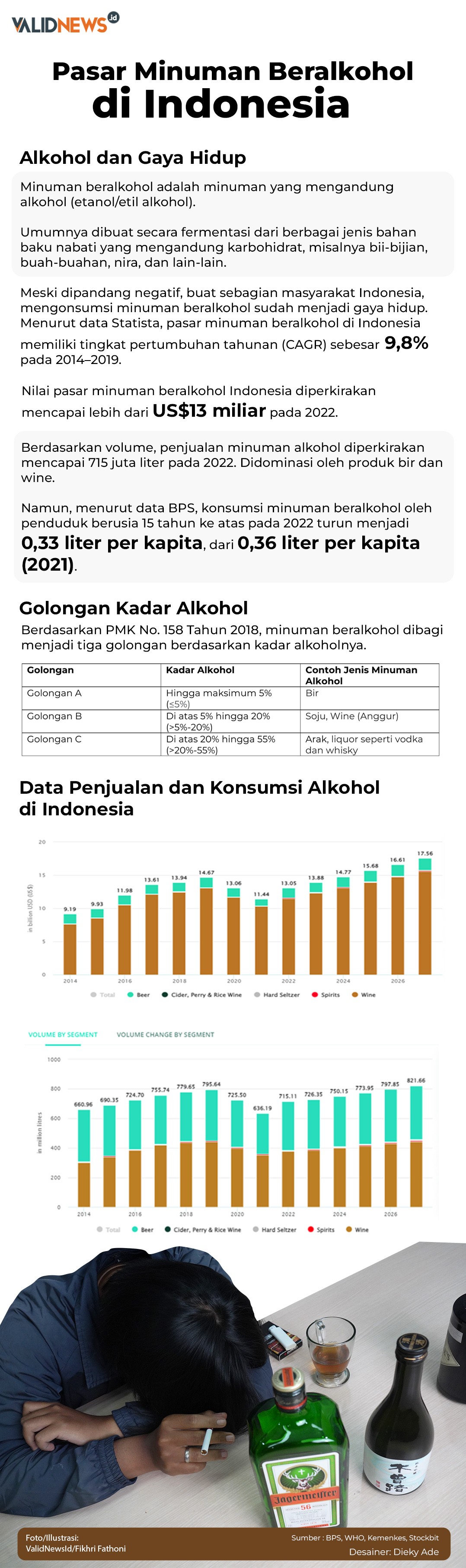 Lebih lanjut, jika dilihat berdasarkan jenis minumannya, data laporan yang sama menunjukkan bahwa persentase terbesar adalah pada jenis bir, yaitu mencapai 29,5%. Kemudian, diikuti jenis minuman beralkohol tradisional keruh sebesar 23,4%; jenis anggur/arak sebesar 21,6%; serta minuman tradisional bening 15,3%.