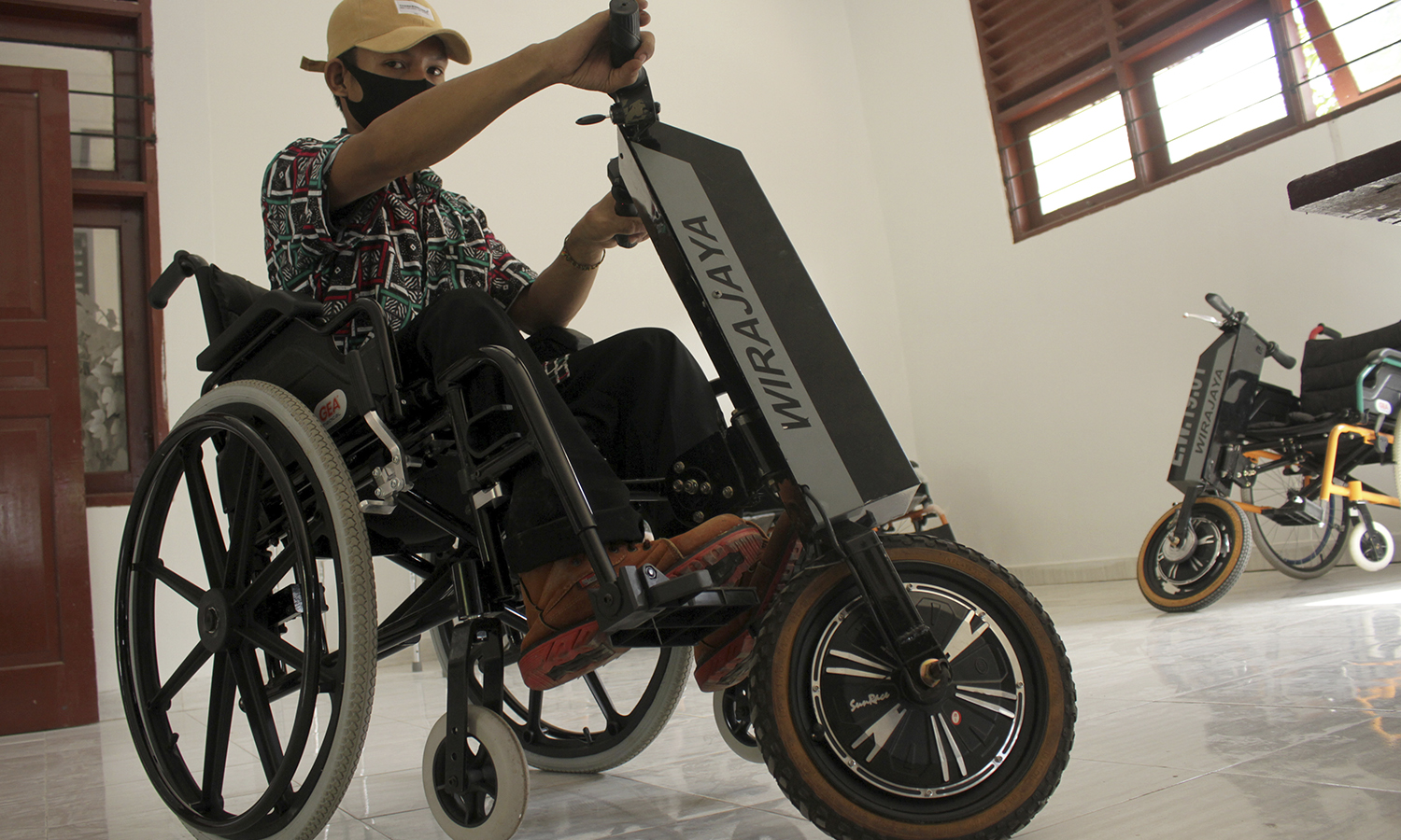 Seorang penyandang disabilitas mengoperasikan kursi roda elektrik di Balai Rehabilitasi Sosial Penyandang Disabilitas Fisik Wirajaya Makassar, Sulawesi Selatan, Selasa (20/4/2021). ANTARA FOTO/Arnas Padda