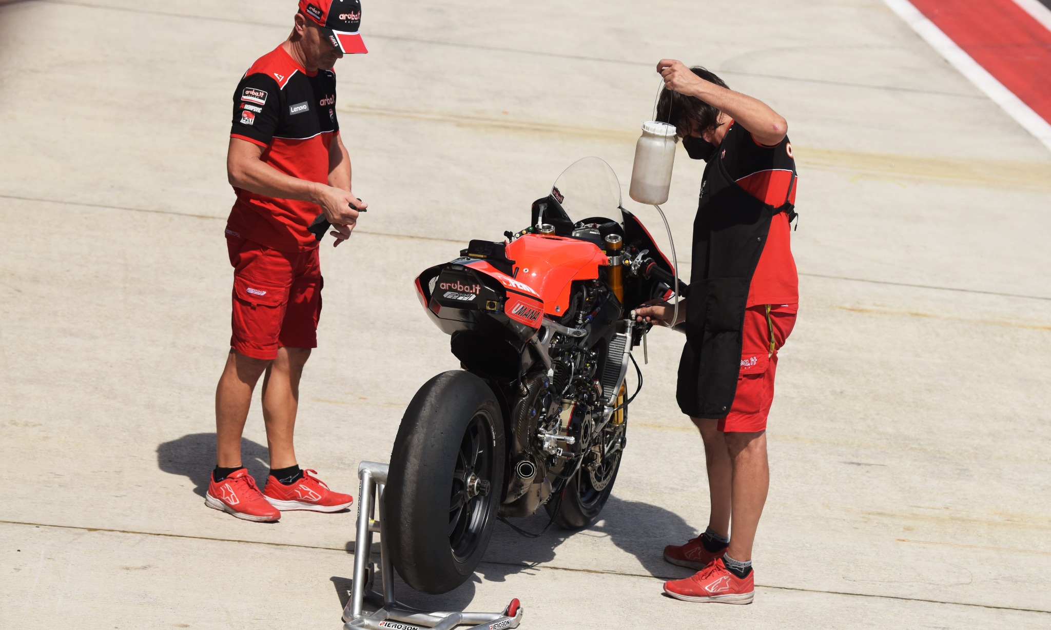 Mekanik tim Aruba.it Racing-Ducati WSBK mengecek sepeda motor di Pertamina Mandalika International S treet Circuit, Lombok Tengah, Nusa Tenggara Barat, Kamis (18/11/2021). Balapan WSBK Mandalika yang menjadi seri pamungkas World Superbike musim 2021 itu dijadwalkan berlangsung pada Jumat (19/11/2021) hingga Minggu (21/11/2021). ANTARAFOTO/Andika Wahyu Atas permintaan pabrikan Jepang, Eropa pun mengikuti. Pada musim 1988, digelarlah untuk pertama kali World Superbikes, sebuah kategori yang diciptakan untuk seri motor 750cc, dengan mesin bertipe empat silinder empat-tak.