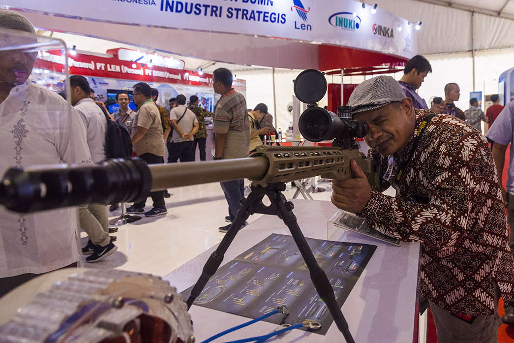 Seorang pengunjung mencoba senjata runduk buatan PT Pindad, SPR 4, pada pameran teknologi nasional Ritech Expo 2018 di Kompleks Gubernuran Riau, Kota Pekanbaru. ANTARA FOTO/FB Anggoro