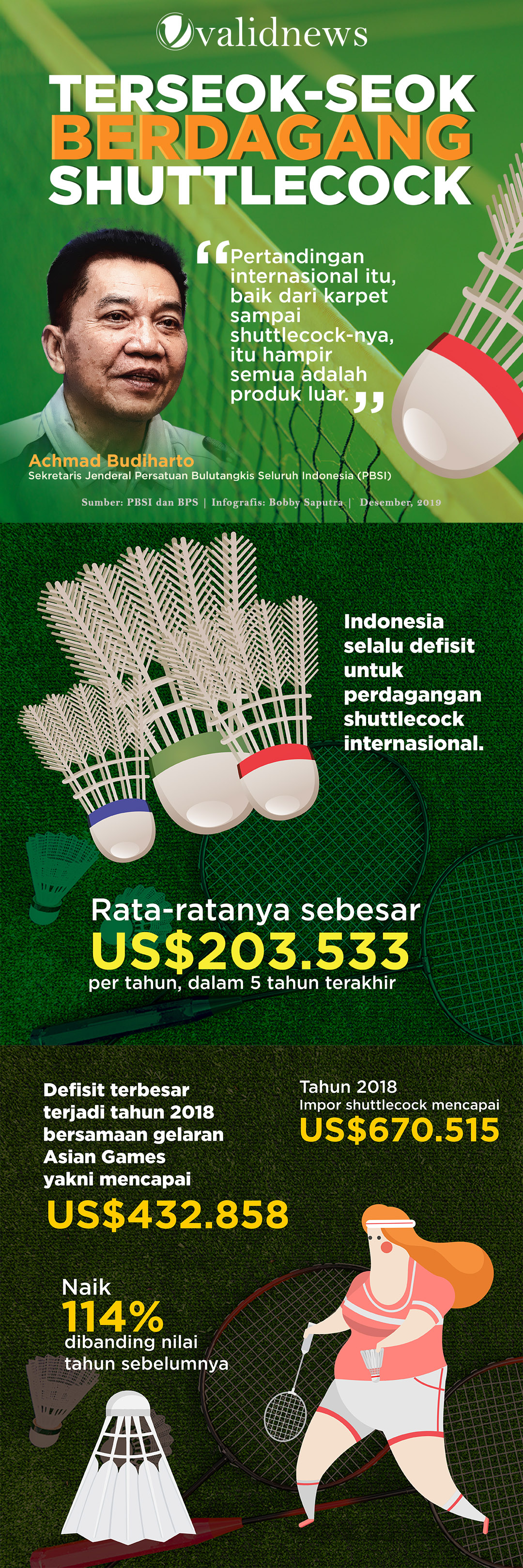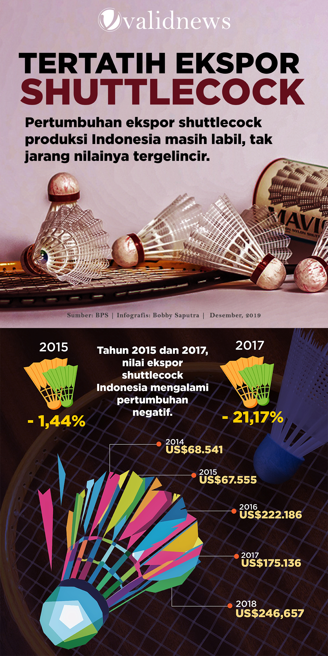 Derasnya impor perlengkapan olahraga, khususnya shuttlecock untuk bulu tangkis, sebenarnya bukan karena perusahaan Indonesia taka da yang bisa membuatnya. Toh, jika mengintip data Badan Pusat Statistik (BPS), Indonesia ternyata mampu mengekspor shuttlecock ke mancanegara. Nilainya rata-rata mencapai US$156.015 per tahun dalam periode 2013–2018.