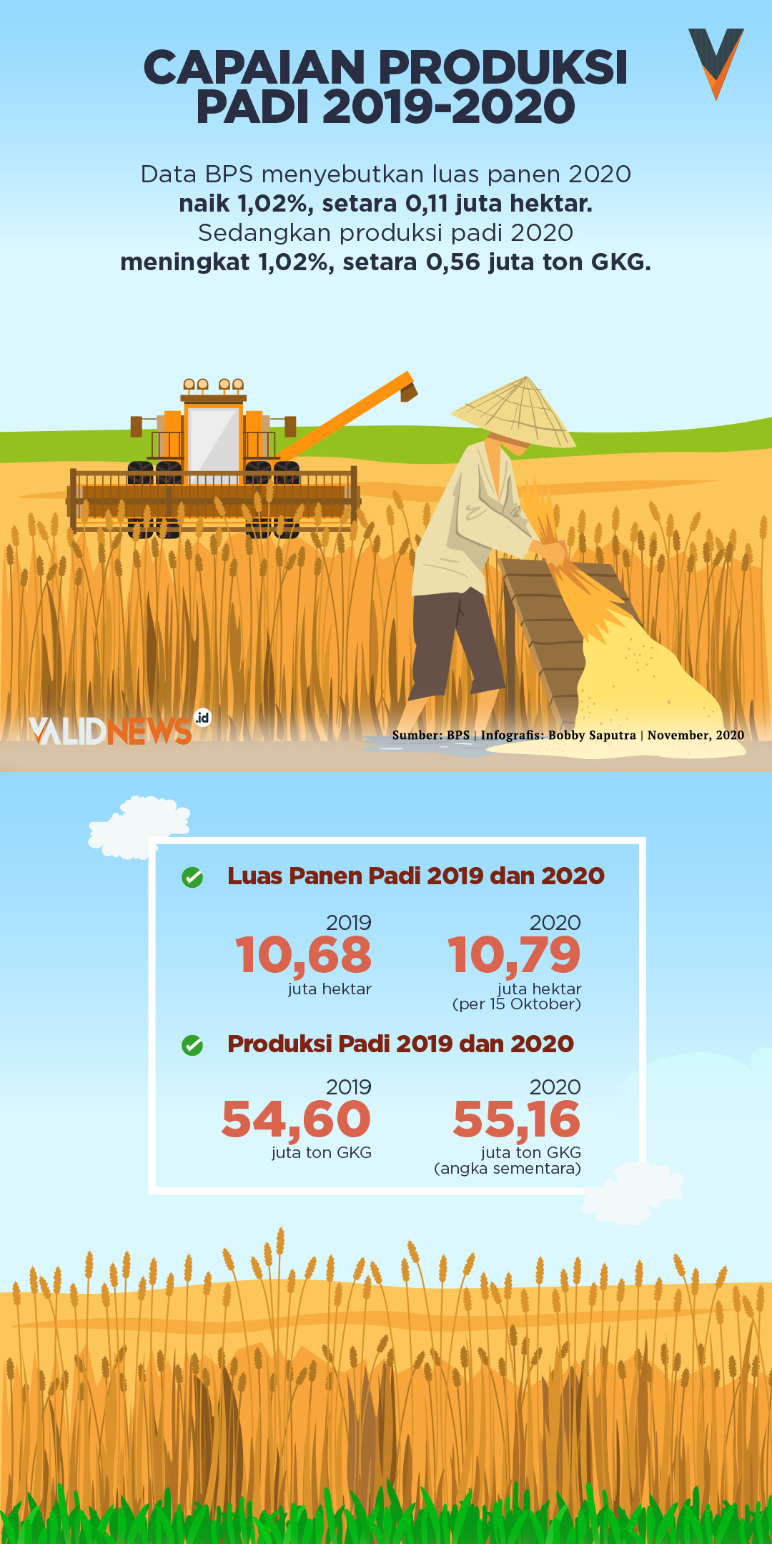 Sementara, produksi padi pada 2019 turun 7,76% dibandingkan 2018 menjadi 546 juta ton gabah kering giling. Produksi padi tahun ini diperkirakan naik 1,02%, setara 0,56 juta ton gabah kering giling.