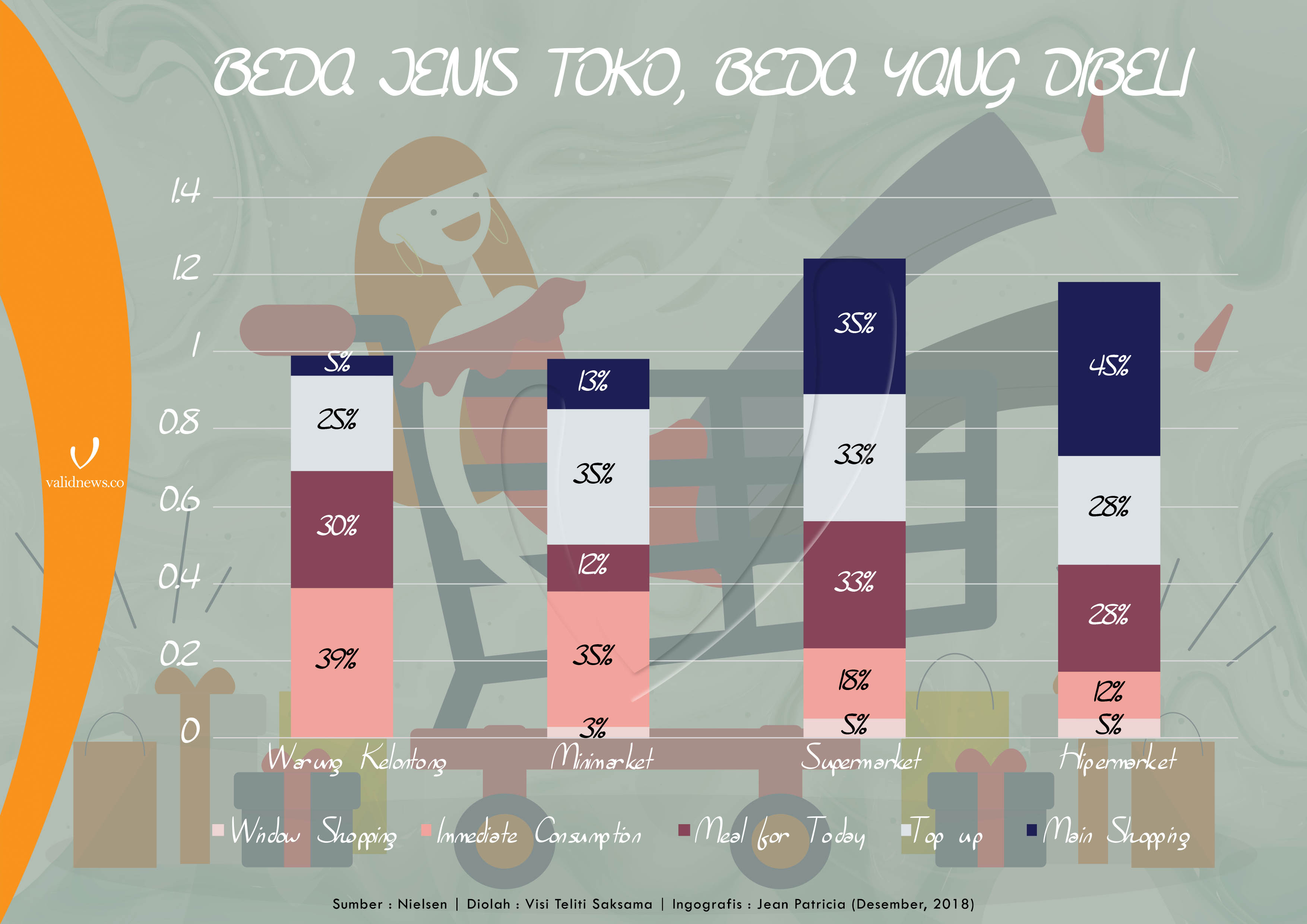 Mengutip data Nielsen, pembelian produk yang sifatnya impulsif memang lebih banyak dijumpai dalam transaksi di minimarket. Dari total transaksi yang terjadi di minimarket, sebanyak 35% pembelian dilakukan secara spontan. Sementara itu, jenis pembelian secara spontan ini di warung kelontong hanya 25% dari total transaksi.