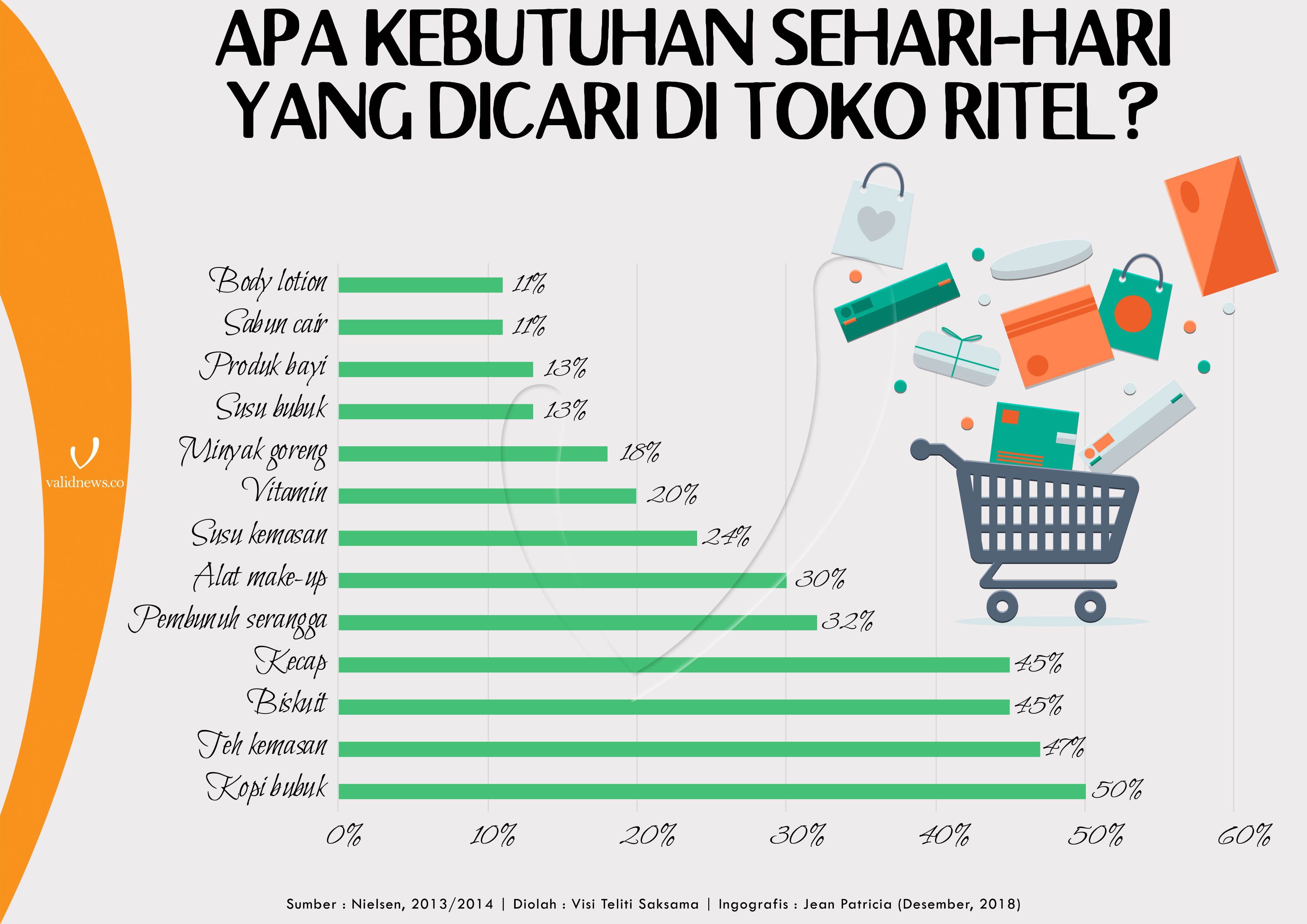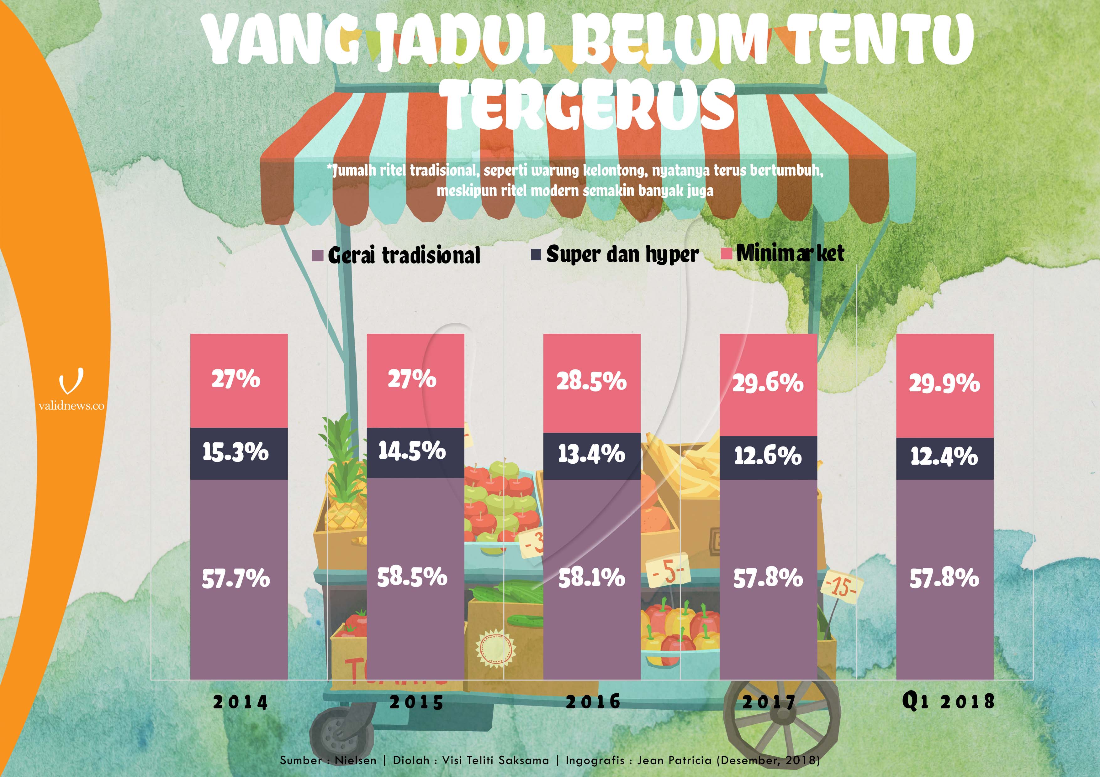 Menurut riset yang dilakukan Nielsen, proporsi warung atau gerai ritel tradisional di Indonesia tetap mencapai 58,02% dalam 4 tahun terakhir dari total toko ritel kebutuhan sehari-hari. Sementara itu, proporsi minimarket pada periode yang sama hanya di kisaran 28,02%.