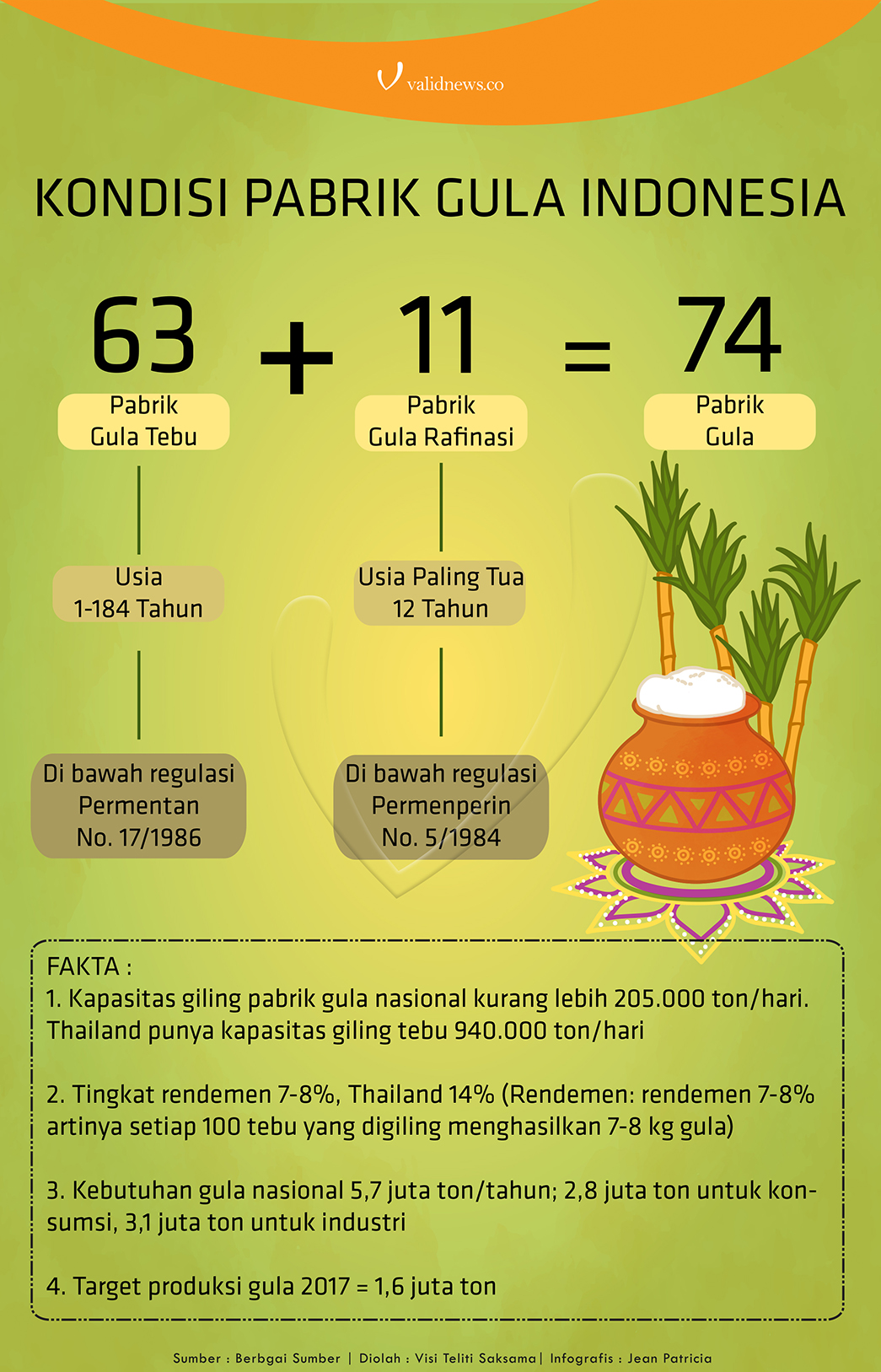 JAKARTA – Ketergantungan Indonesia akan impor gula tak akan sirna. Pasalnya, kebutuhan yang terus bertumbuh tak dapat dipenuhi oleh industri gula dalam negeri. Mesin-mesin pabrik gula berumur ratusan tahun (100-187 tahun) masih mendominasi hingga 59,7% dan perubahan peruntukan lahan pertanian masih menjadi kendala.
