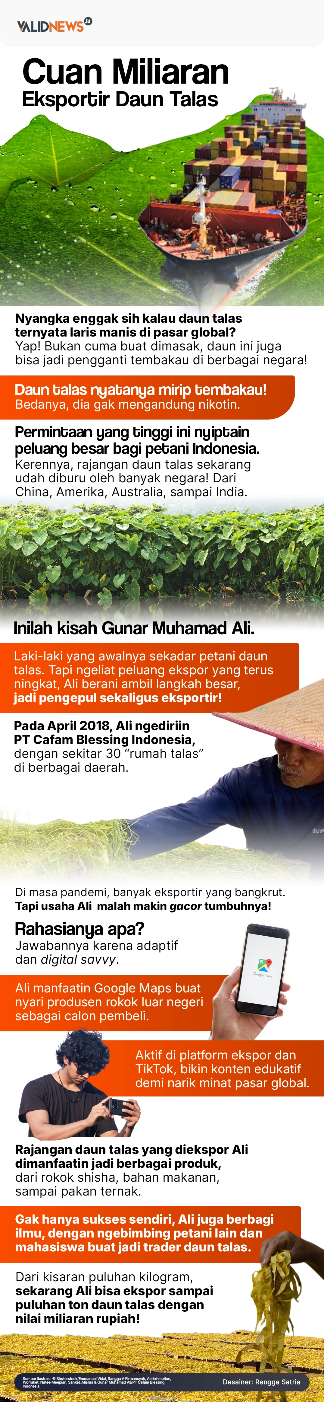 LUMAJANG - Siapa sangka, daun talas yang biasa dianggap sebagai gulma rupanya berhasil mengantarkan Gunar Muhamad Ali (37 tahun) atau yang akrab disapa Ali, sukses menjadi eksportir. Pria yang awalnya berprofesi sebagai petani di Kabupaten Lumajang, Jawa Timur ini mampu membaca peluang dan gigih belajar hingga menjadi pelaku usaha di pasar global.