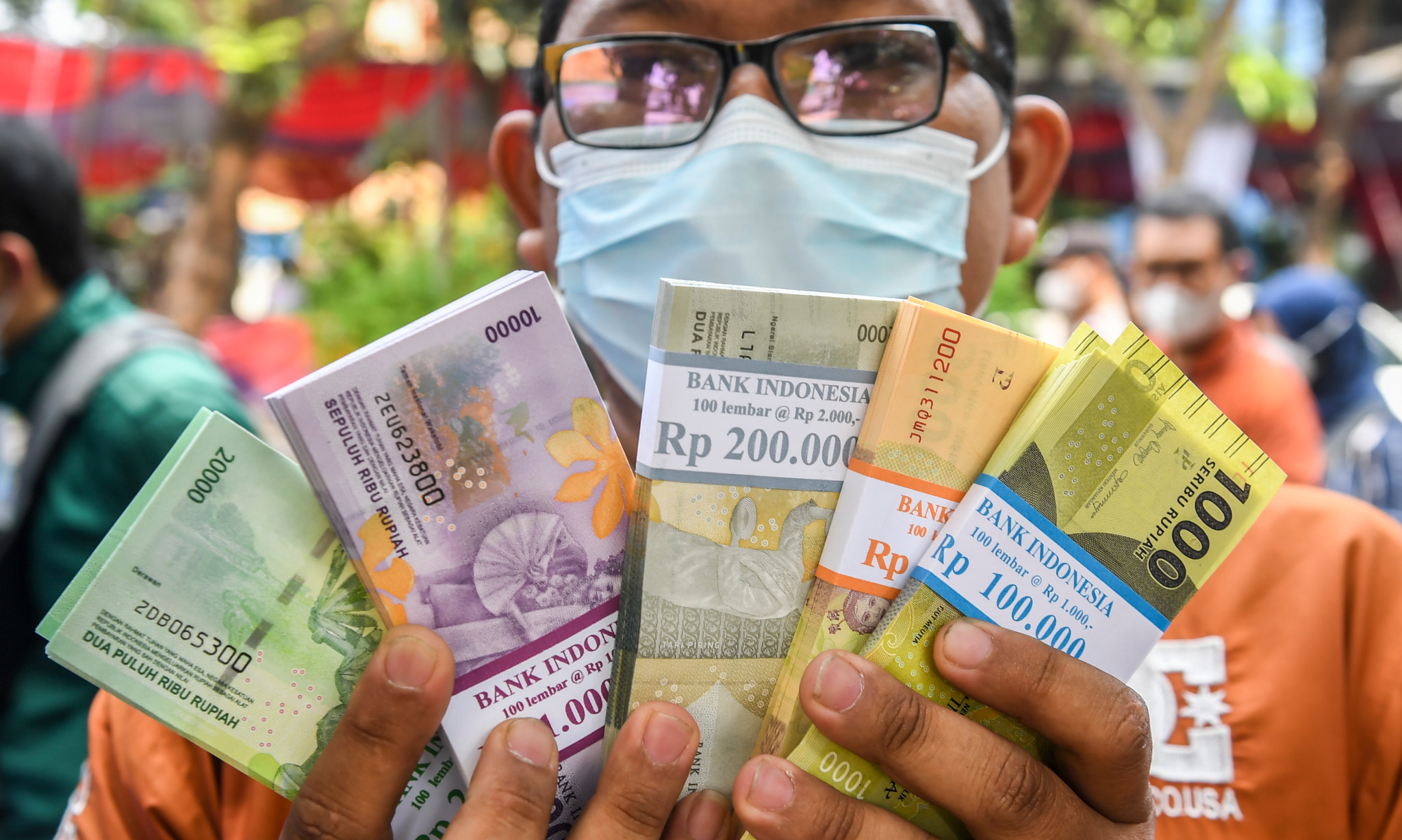 Warga menunjukan uang baru usai ditukarkan di mobil kas keliling Bank Indonesia (BI) di Pasar Induk Kramat Jati, Jakarta, Selasa (19/4/2022). Antara Foto/Galih Pradipta