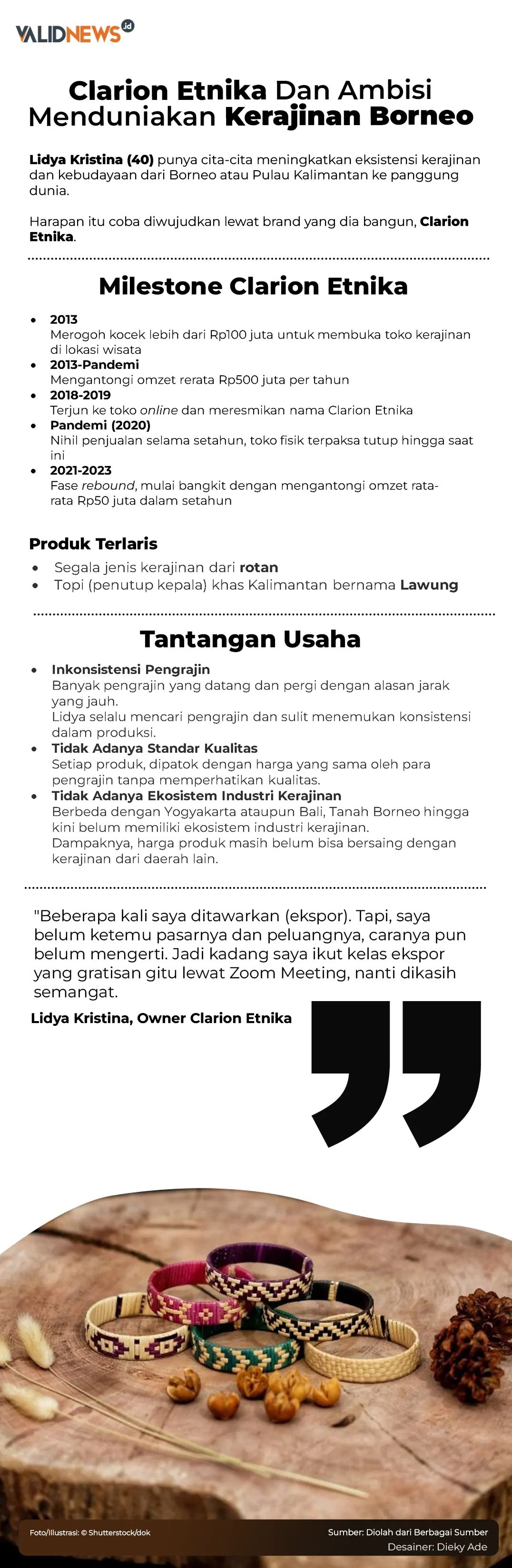 Sederet jalan terjal menghadang Lidya Kristina untuk menduniakan kerajinan dari Tanah Borneo lewat Clarion Etnika.