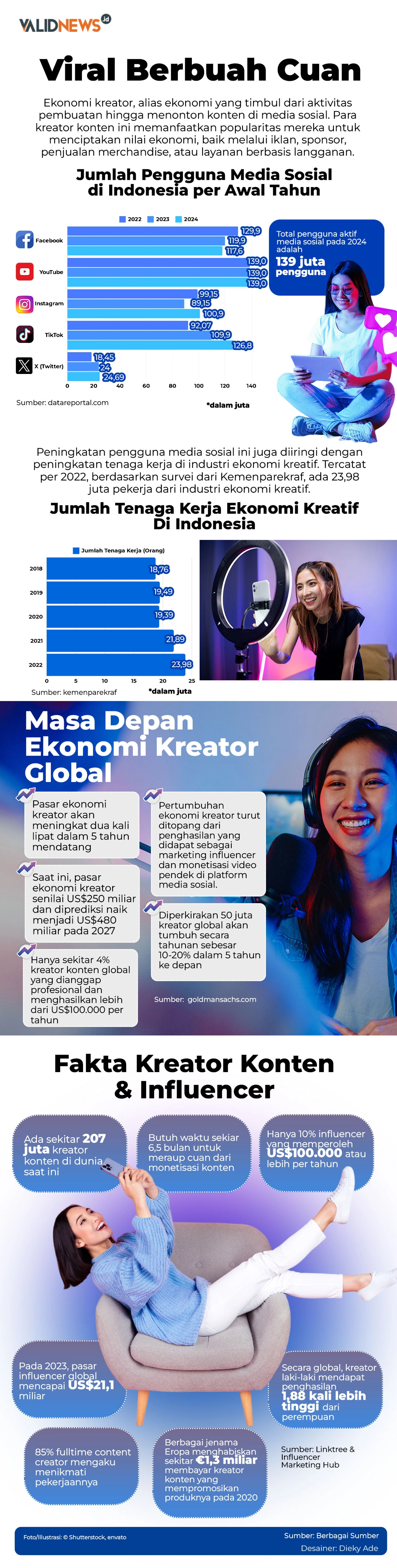 Laporan datareportal.com mendukung premis Piter. Pengguna aktif media sosial di Indonesia pada awal 2024 mencapai 139 juta orang. Itu sudah hampir setengah populasi RI yang sebanyak 270 juta jiwa. Kemudian, platform digital yang paling banyak penggunanya, yaitu YouTube (139 juta orang), TikTok (126,8 juta orang), Facebook (117,6 juta orang), serta Instagram (100,9 juta orang).