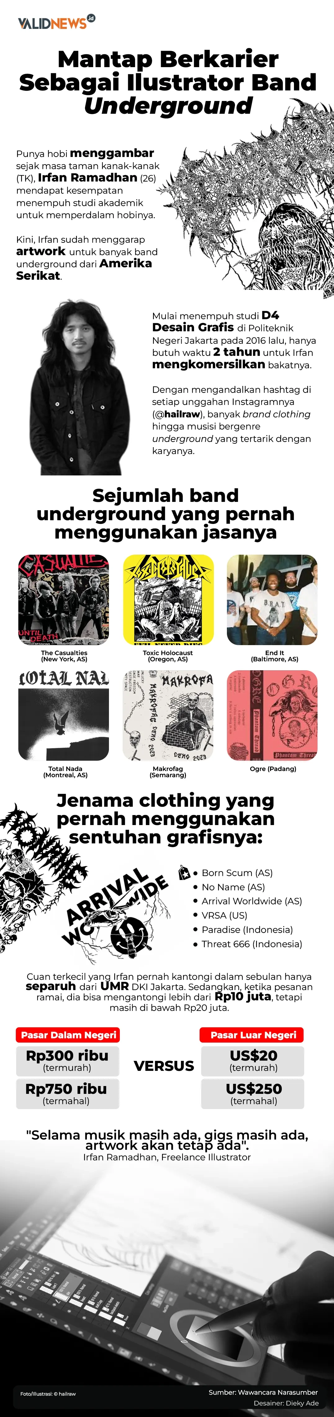 Dia adalah Irfan Ramadhan, sang ilustrator untuk kelompok musik atau band-band "bawah tanah" (underground). Jika Anda penikmat kelompok musik yang tak pernah terlihat di permukaan media mainstream dan berirama lebih keras dari rock biasa, Irfan adalah salah satu pembuat logo, cover album, hingga merchandise dari banyak band tersebut.