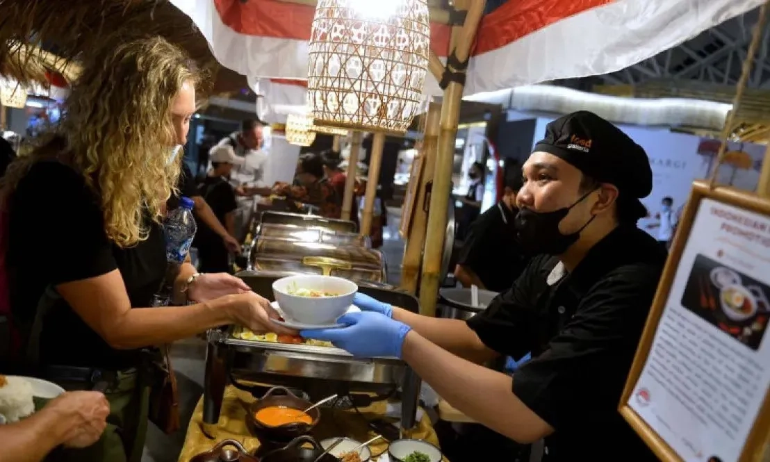 Petugas menyajikan makanan khas Indonesia di stan kegiatan Indonesia Spice Up The World di Terminal Keberangkatan Internasional Bandara Internasional I Gusti Ngurah Rai, Badung, Bali, Rabu (17/8/2022). Antara Foto/Fikri Yusuf