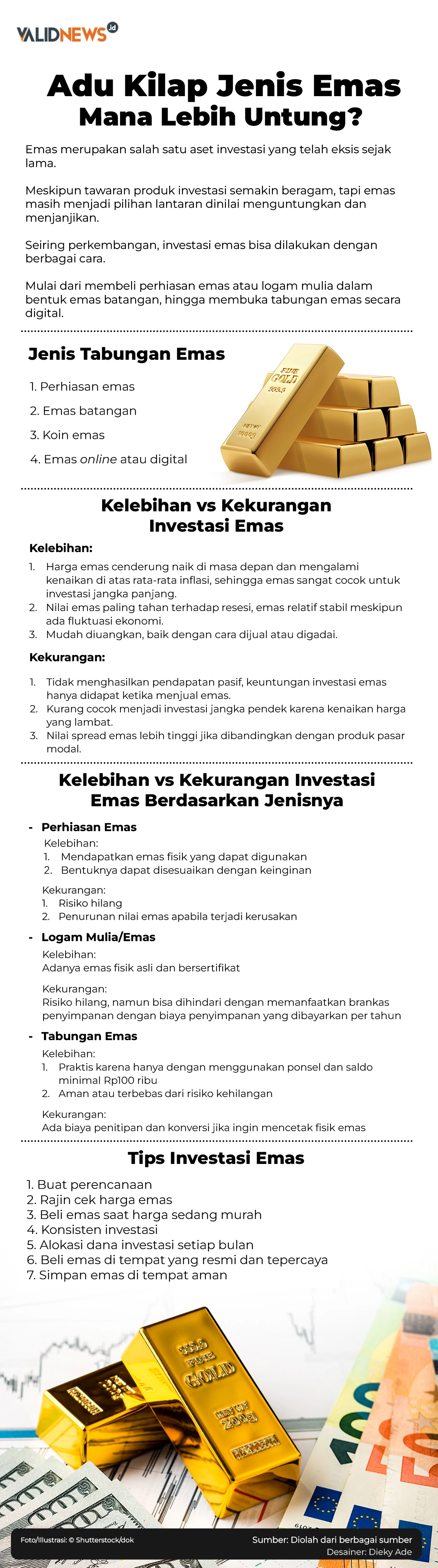 Selain itu, kini investasi emas juga bisa dilakukan dengan cara beragam. Mulai dari membeli perhiasan emas, membeli logam mulia dalam bentuk emas batangan, hingga membuka tabungan emas secara digital.
