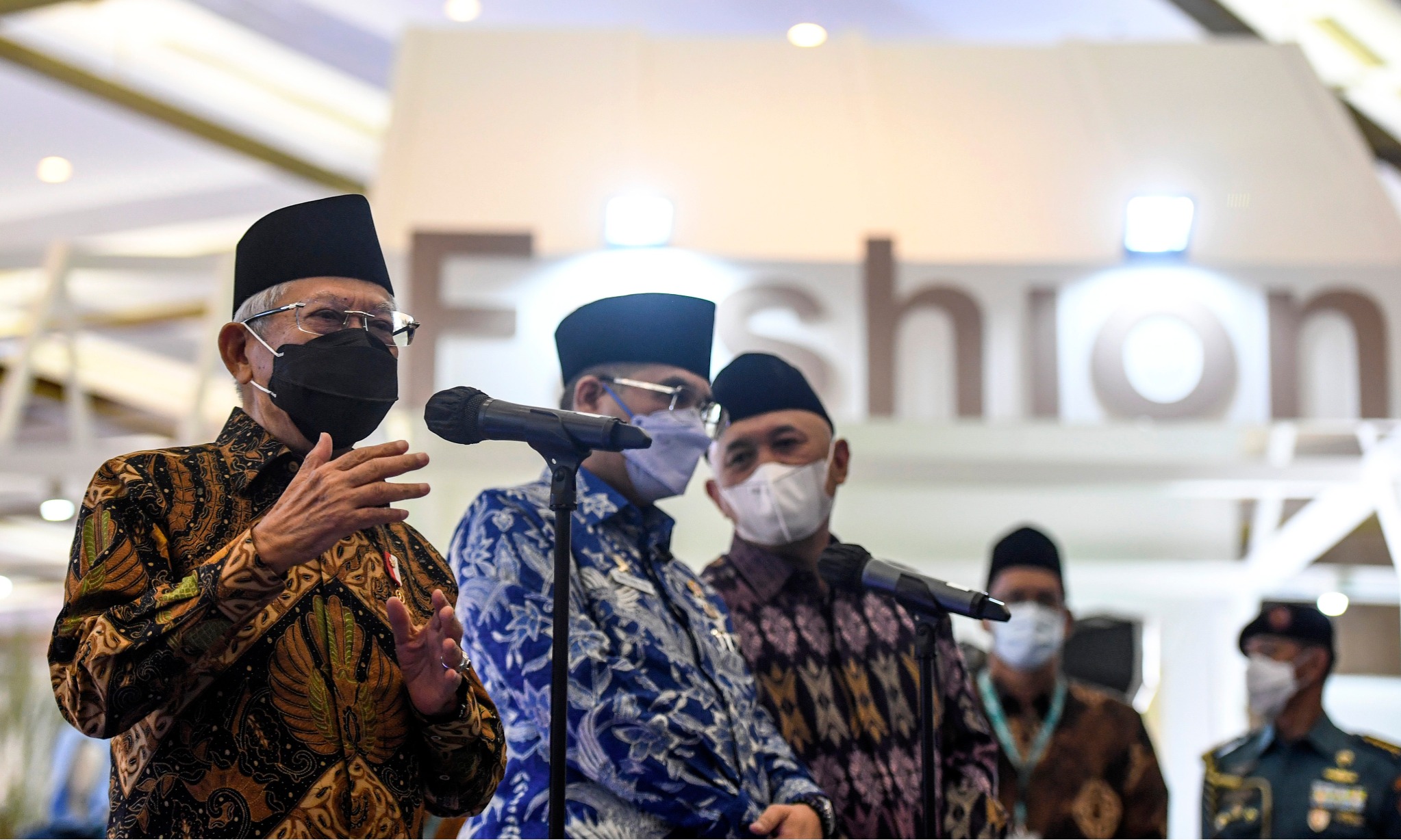 Wakil Presiden Ma'ruf Amin (kiri) memberikan keterangan kepada media usai membuka Indonesia Sharia E conomic Festival (ISEF) 2022 di JCC Senayan, Jakarta, Kamis (6/10/2022). ANTARA FOTO/Hafidz Mubarak Salah satu yang menjadi sorotan pada ISEF 2022 kali ini adalah Indonesia International Modest Fashion Festival (IN2MOTIONFEST). Di mana pada acara ini menjadi ajang bagi para brand dan desainer lokal untuk memperkenalkan karya-karya terbaik industri fesyen muslim Indonesia ke skala global.