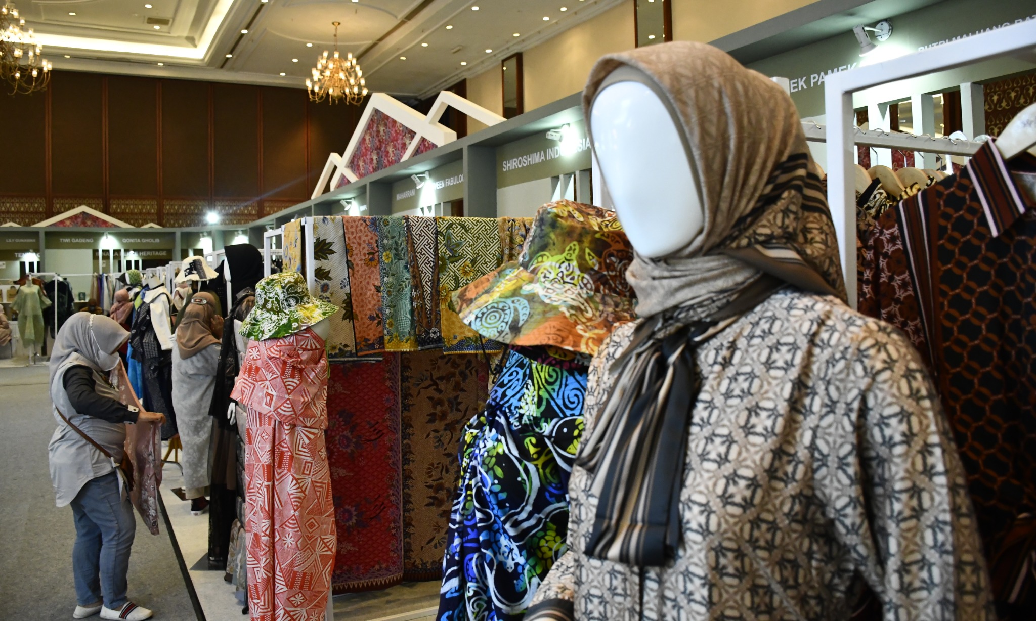 Pekerja merapikan busana muslimah dalam acara Economic Festival (ISEF) 2022 di Jakarta Convention Ce nter (JCC), Jakarta Pusat, Rabu (5/10/2022). ValidnewsID/Fikhri Fathoni