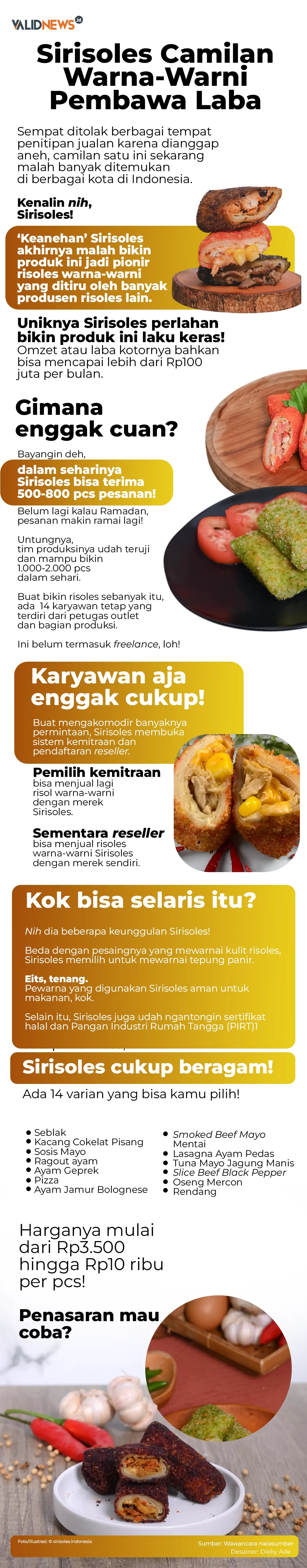 Risoles warna-warni dari Sirisoles menjadi pionir risoles warna-warni. Kini, Sirisoles bisa meraup Rp100 juta per bulannya.
