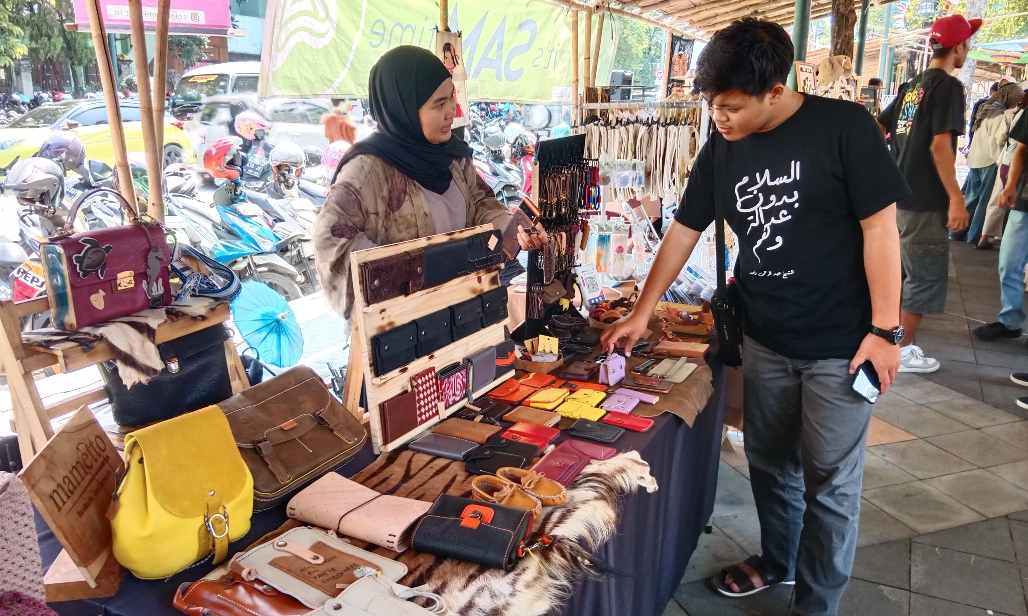 Pengunjung menyambangi stand kerajinan kulit handmade Mametto Leather di ajang Solo Art Market (SAM) di Solo, Jawa Tengah, Minggu (20/7). ValidNewsID/Fin Harini