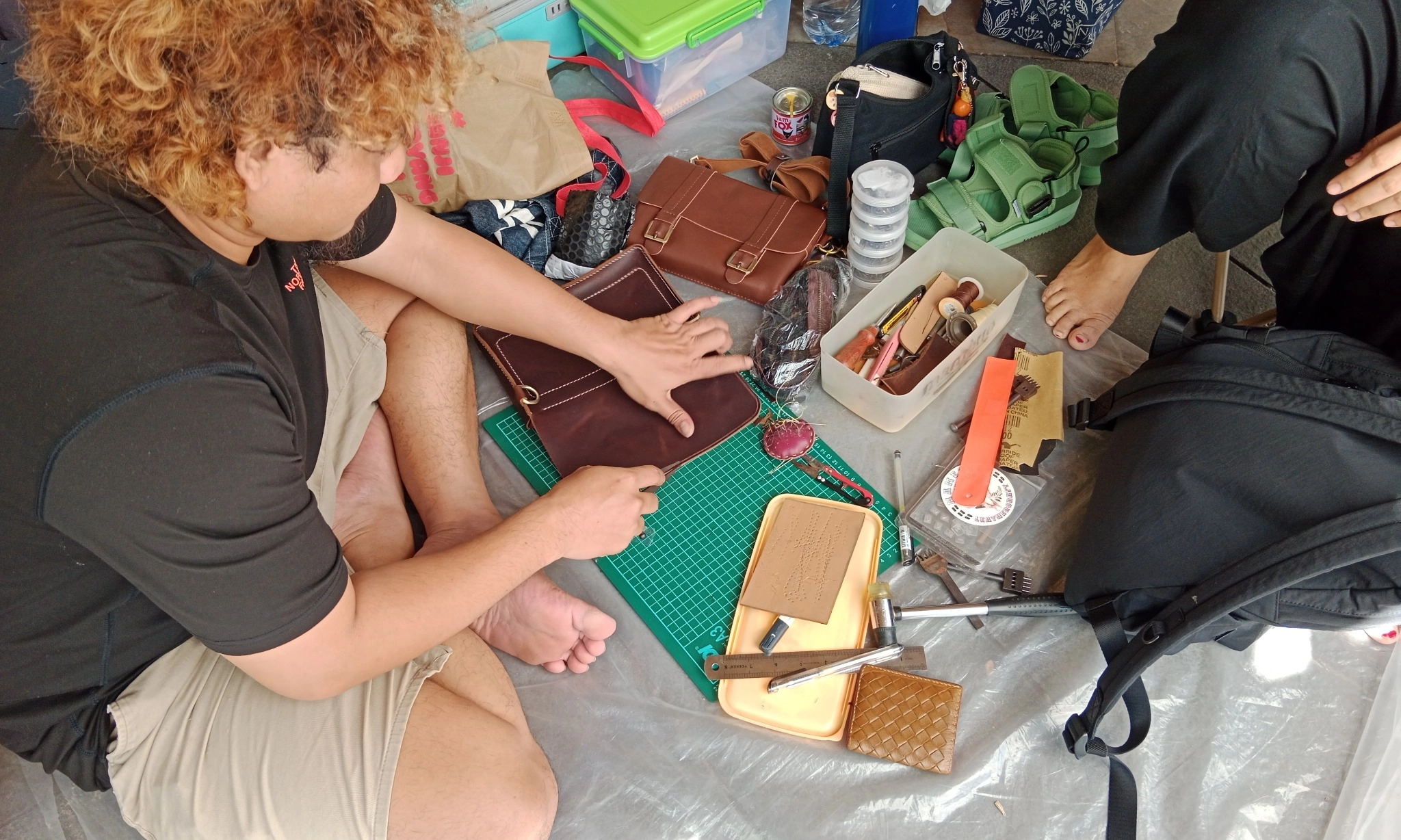 Pemilik Mametto Leather, Nur Achmad Zaenal, tengah mengerjakan sebuah tas, di sela Solo Art Market di Solo, Jawa Tengah, Minggu (20/7). ValidNewsID/Fin Harini