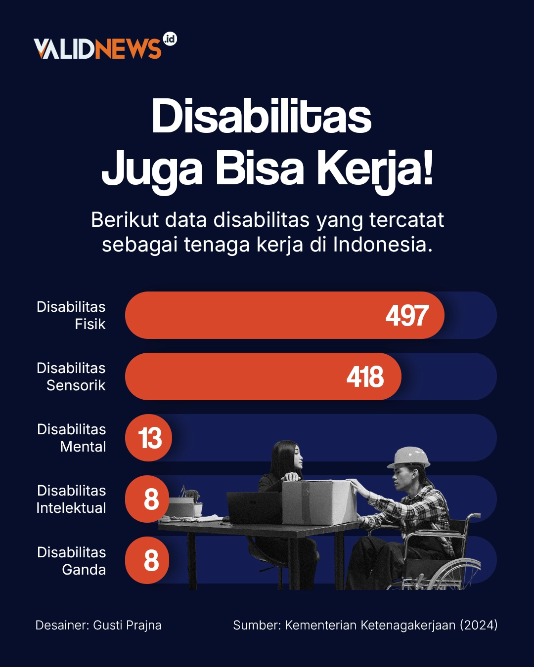 Sementara itu, catatan mengenai angka tenaga kerja disabilitas yang bekerja di sektor formal berbeda. Misalnya, berdasarkan Survei Angkatan Kerja Nasional (Sakernas) BPS di tahun 2024, terdapat 1,04 juta penyandang disabilitas usia produktif dengan 928.000 di antaranya sudah bekerja. Sedangkan Kementerian Ketenagakerjaan melalui Unit Layanan Disabilitas (ULD) Ketenagakerjaan per September 2025 mencatat, baru ada 795 orang penyandang disabilitas yang berhasil ditempatkan bekerja di 16 provinsi, dengan Jawa Barat menjadi provinsi dengan pekerja disabilitas terbanyak.