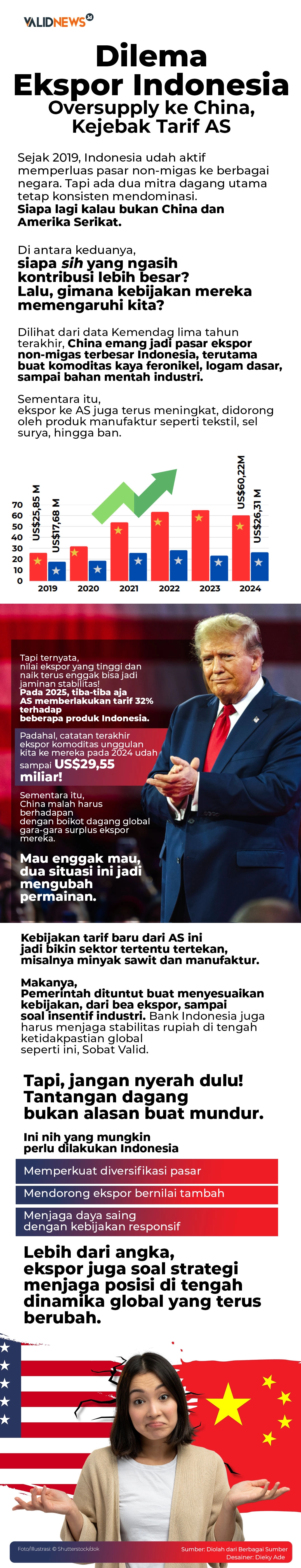Secara historis, data ekspor nonmigas Indonesia ke China periode 2019-2024 menunjukkan tren peningkatan, rata-rata sebesar US$49,98 miliar atau 21,7% dari total ekspor. Di sisi lain, ekspor Indonesia ke AS di periode sama juga menunjukkan tren peningkatan, dengan rata-rata ekspor mencapai US$23,3 miliar atau hanya sebesar 10,51% dari total ekspor.
