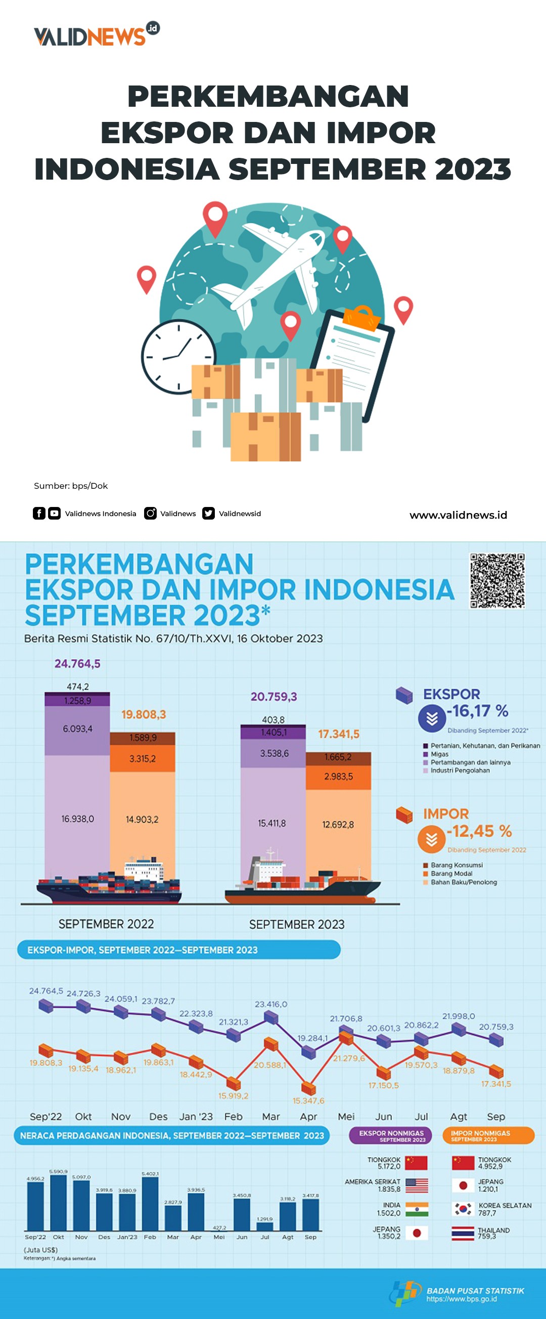 Sedangkan impor non-migas September 2023 senilai US$14,01 miliar, turun 13,60% dibandingkan Agustus 2023 dan turun 14,46% dibandingkan September 2022.