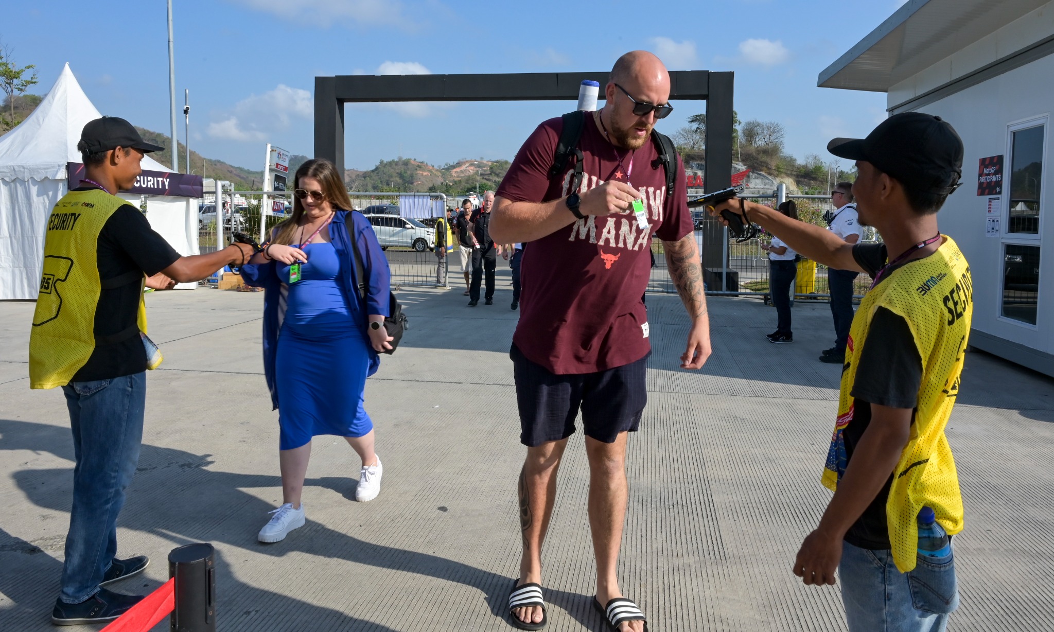 Petugas memindai QR Code anggota tim pembalap yang akan memasuki paddock menjelang balapan hari pert ama MotoGP Mandalika 2023 di Pertamina Mandalika International Street Circuit di KEK Mandalika, Lombok Tengah, NTB, Jumat (13/10/2023). Antara Foto/Ahmad Subaidi Menyerap Tenaga Kerja