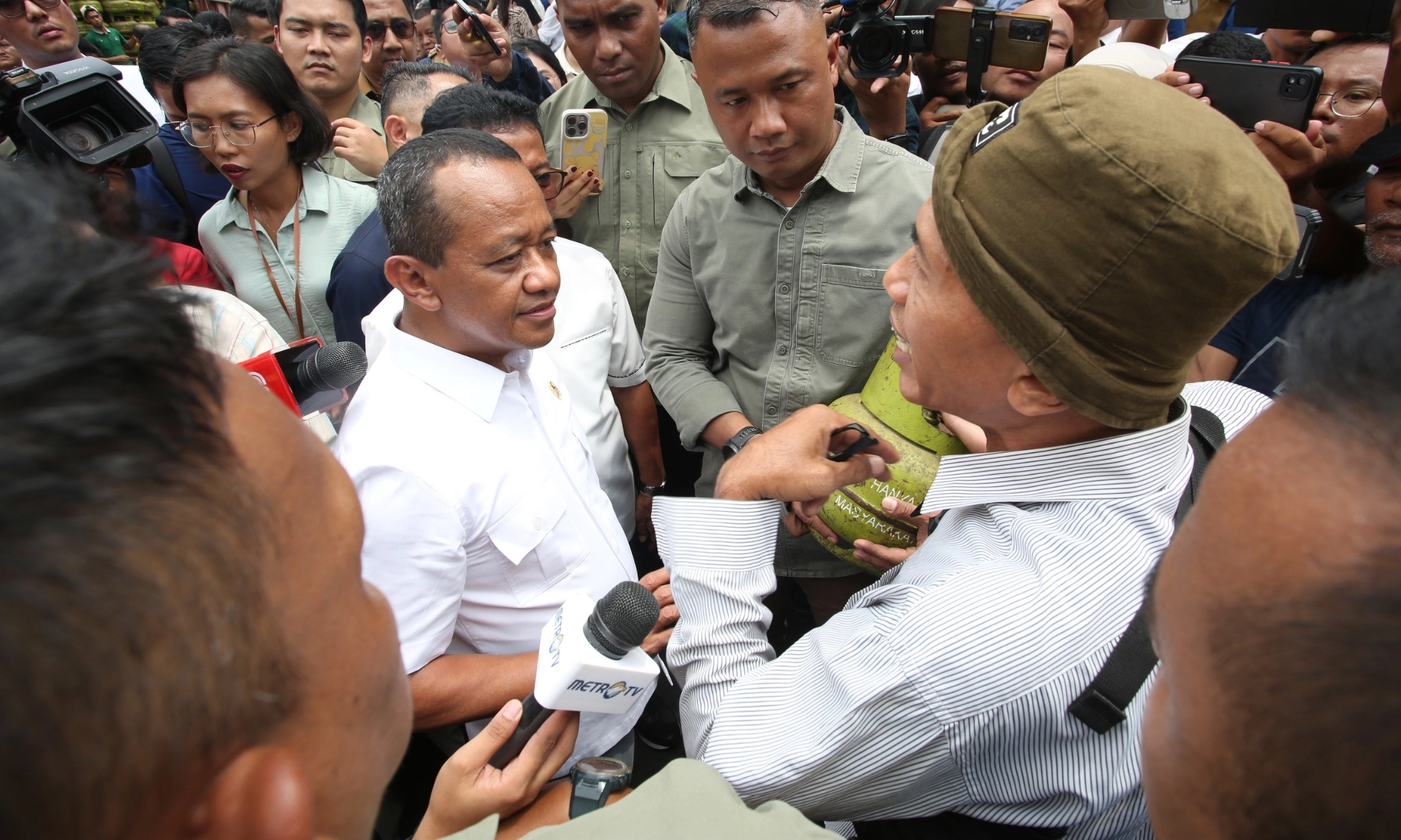 Menteri ESDM Bahlil Lahadalia (kedua kiri) berdialog dengan warga yang mengamuk saat antre membeli gas 3 kg di Karawaci, Tangerang, Banten, Selasa (4/2/2025). Antara Foto/Muhammad Iqbal