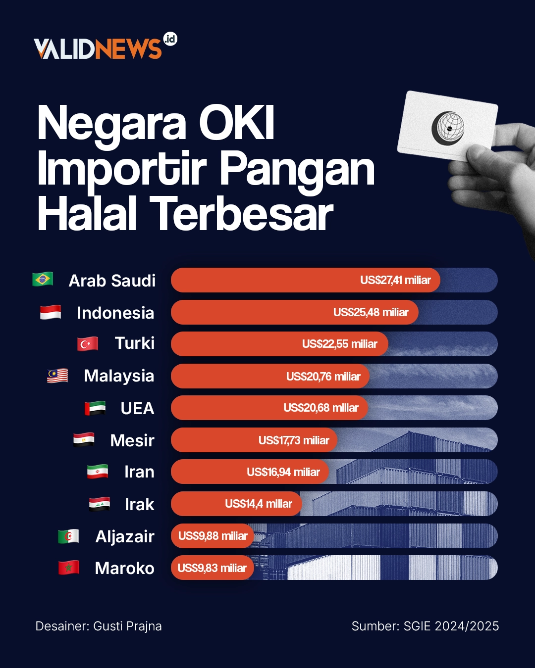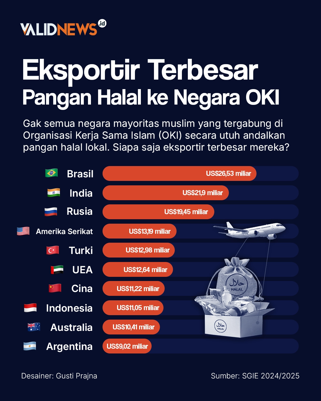 Paradoks ini tercatat dari data SGIE Report 2024/2025 yang menunjukkan, supplier pangan halal andalan ke OKI di 2023 masih dipegang erat oleh negara yang notabene nonmuslim. Di catatan ini, ada Brasil yang memperoleh US$26,53 miliar, disusul India dengan US$21,90 miliar, juga Rusia dengan nominal US$19,45 miliar; dan Amerika Serikat senilai US$13,19 miliar.