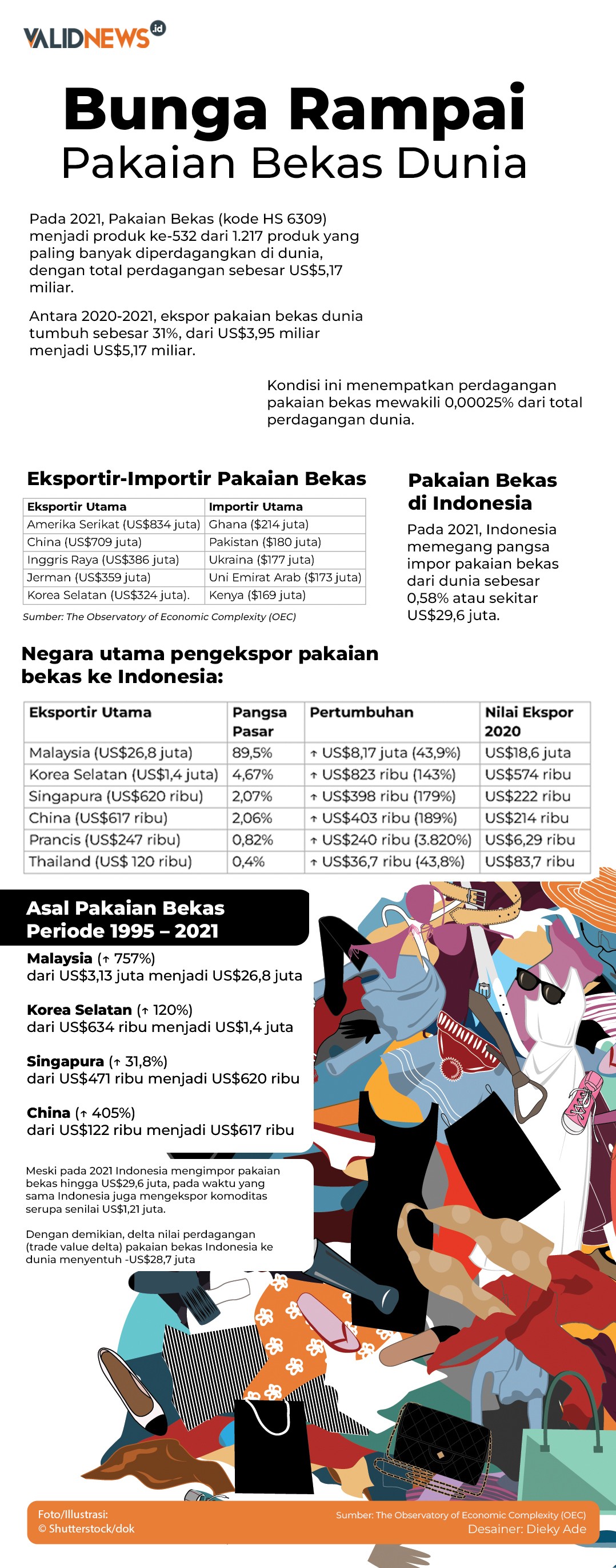 Kondisi Indonesia ini, tak ubahnya seperti yang terjadi di Ghana, importir terbesar dunia untuk pakaian bekas. Data The Observatory of Economic Complexity (OEC) menunjukkan Ghana mengimpor pakaian bekas senilaui US$214 juta pada 2021.
