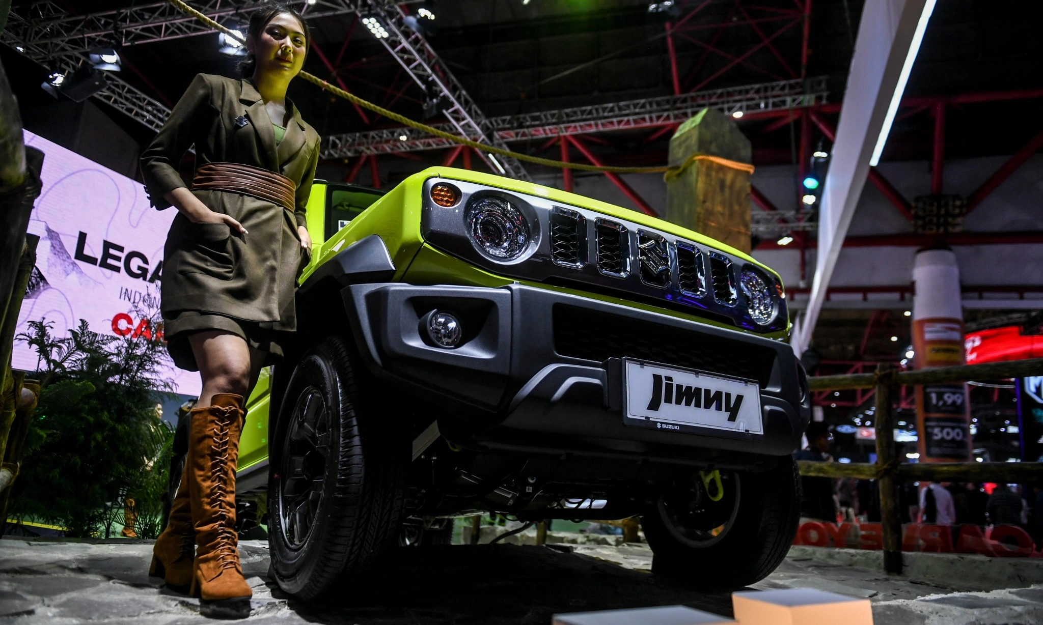 Model berdiri di dekat mobil Suzuki Jimny 5 Pintu yang dipamerkan dalam Indonesian International Motor Show (IIMS) 2024 di JIExpo Kemayoran, Jakarta, Kamis (15/2/2024). Antara Foto/Hafidz Mubarak A