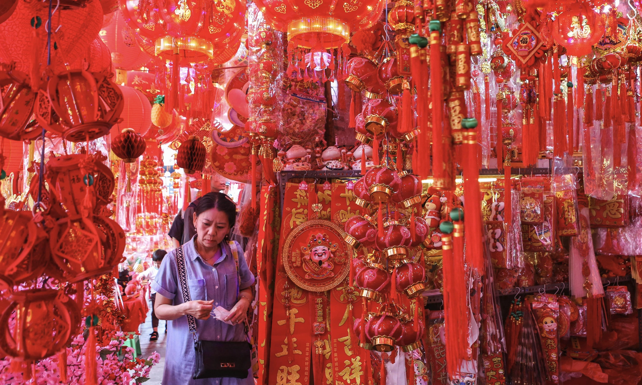 Calon pembeli melihat pernak pernik imlek yang dijual di kawasan Pecinan Glodok, Jakarta, Kamis (16/ 1/2025). AntaraFoto/Asprilla Dwi Adha
