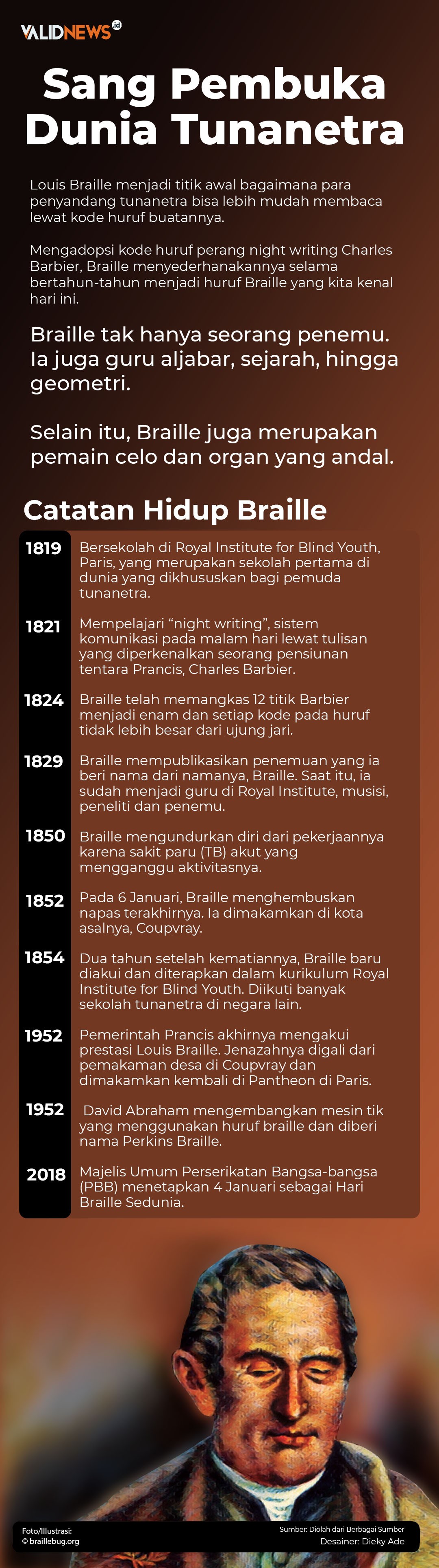Dia adalah seorang penyandang tunanetra yang pada satu masa hidupnya membuat kode abjad khusus untuk membantu para tunanetra bisa membaca. Kita mengenalnya dengan sebutan khas, Huruf Braille.