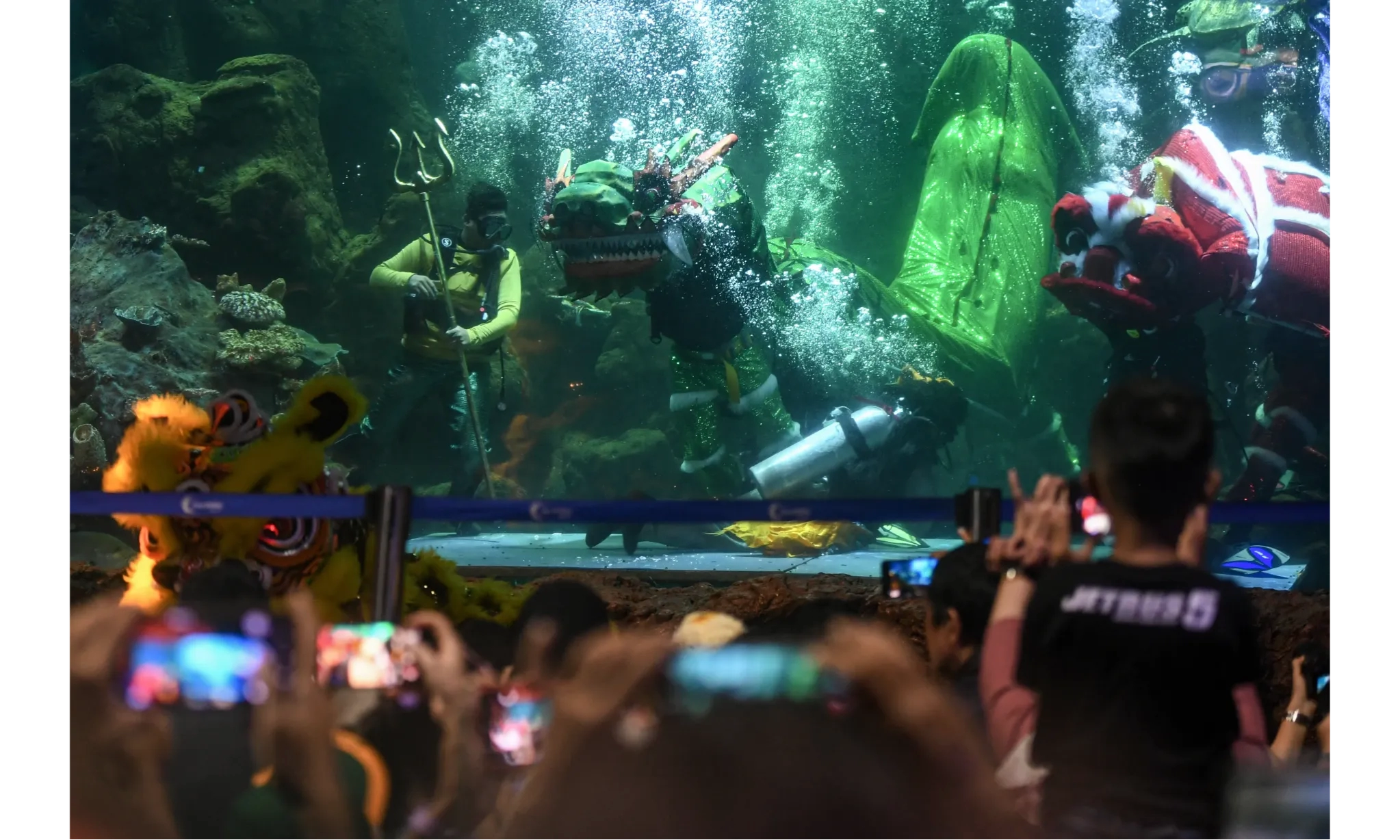 Atraksi barongsai menghibur pengunjung di akuarium Sea World Ancol, Jakarta, Kamis (8/2/2024). Antara Foto/Muhammad Adimaja