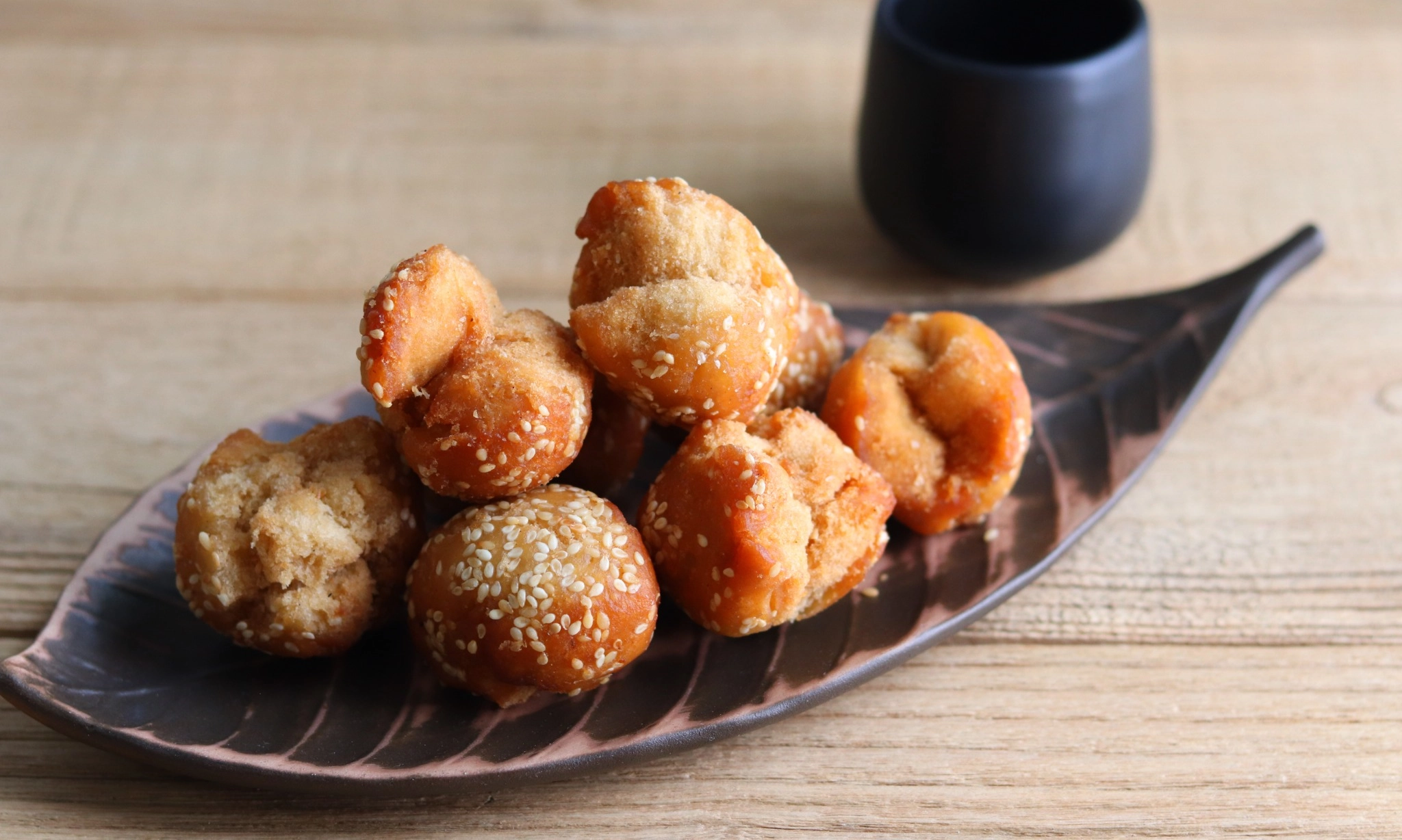 Terbuat dari tepung terigu, gula, dan wijen, lalu digoreng hingga pecah merekah. Teksturnya keras di luar dan renyah, cocok untuk camilan bersama kopi atau teh. Rasanya manis dan gurih dengan aroma wijen yang khas.